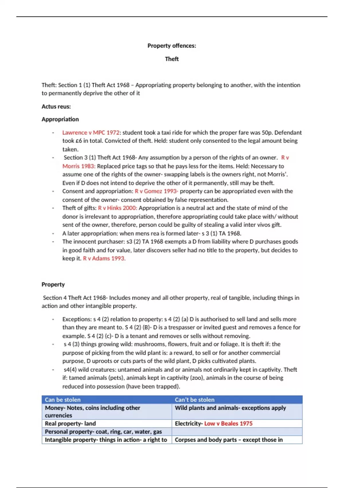 Theft: Section 1 (1) Theft Act 1968 – Appropriating property belonging to another, with the intention