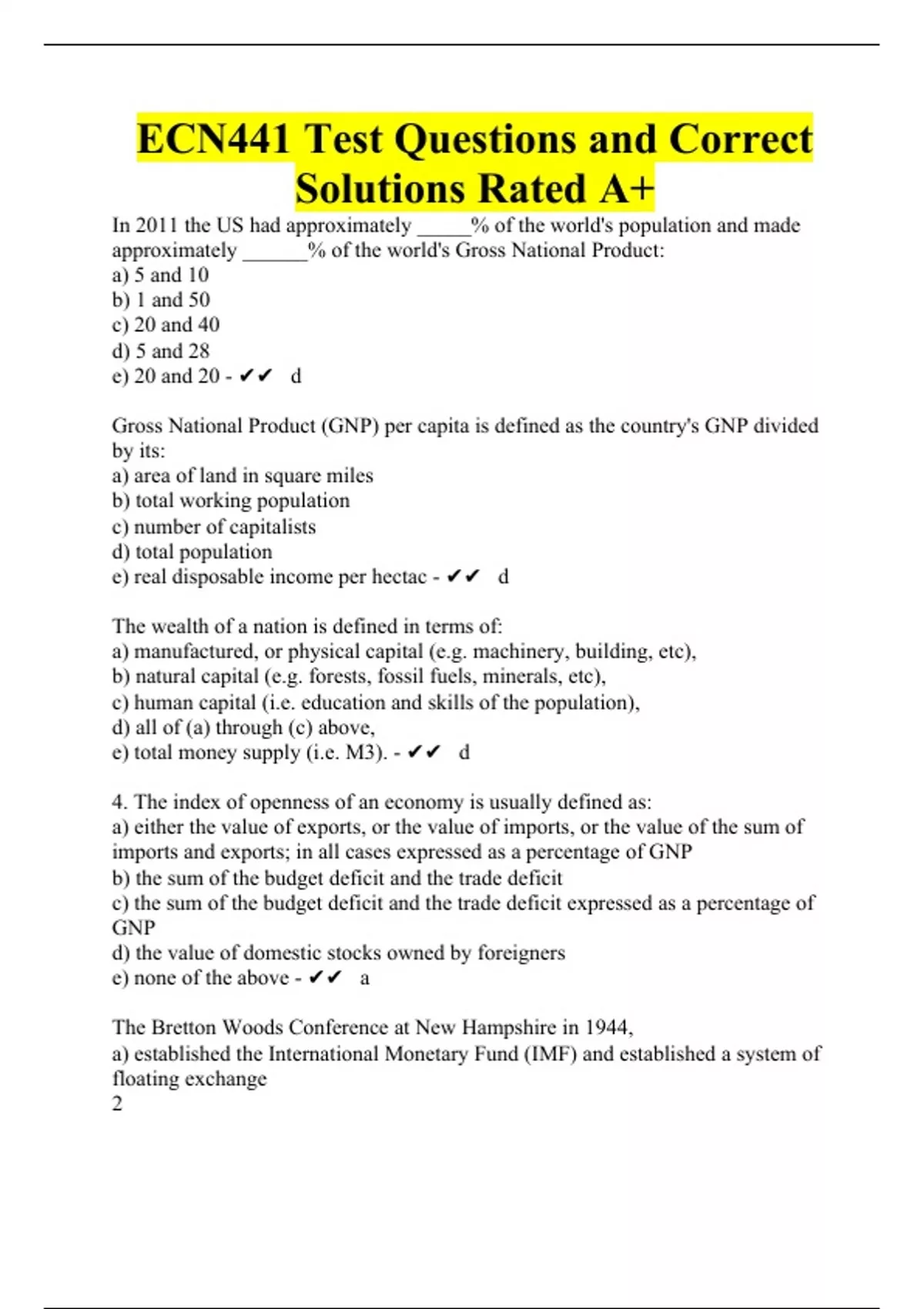 In 2011 the US had approximately _____% of the world's population and made approximately ______% of the world's Gross National Product: a) 5 and 10 b) 1 and 50 c) 20 and 40 d) 5 and 28 e) 20 and 20 - d Gross National Product (GNP) per capita is defined as the country's GNP divided by its: a) area of land in square miles b) total working population c) number of capitalists d) total population e) real disposable income per hectac - d The wealth of a nation is defined in terms of: a) manufactured, or physical capital (e.g. machinery, building, etc), b) natural capital (e.g. forests, fossil fuels, minerals, etc), c) human capital (i.e. education and skills of the population), d) all of (a) through (c) above, e) total money supply (i.e. M3). - d 4. The index of openness of an economy is usually defined as: a) either the value of exports, or the value of imports, or the value of the sum of imports and exports; in all cases expressed as a percentage of GNP b) the sum of the budget deficit and the trade deficit c) the sum of the budget deficit and the trade deficit expressed as a percentage of GNP d) the value of domestic stocks owned by foreigners e) none of the above - a The Bretton Woods Conference at New Hampshire in 1944, a) established the International Monetary Fund (IMF) and established a system of floating exchange 2 rates b) established a formal system of tariffs, quotas and actively encouraged a new world era of protectionism c) sought to promote a new world order of increased international trade and worldwide economic growth through a system of freely floating exchange rates. d) established the International Monetary Fund (IMF) and established a system of adjustable peg, fixed exchange rates - d Which of the following would call for inpayments to the US? a) American imports of German steel b) American unilateral transfers to less developed countries c) American firms selling insurance to British shipping companies d) American tourists staying in a hotel in Mexico. e) none of the above - C The US balance of trade is determined by: a) exchange rates b) growth of economies overseas c) relative prices in world markets d) levels of tariffs and quotas e) all of the above - e The following statistical Balance of Payments data is available for the fictitious economy of Internationale in billions of $ and is relevant for questions (8) through (3): Merchandise exports 700 Merchandise imports -650 Interest and dividend received 80 Interest and dividend paid out -120 Miscellaneous services exported 250 Miscellaneous services imported -320 Net unilateral transfers 30 Net change in foreign assets held by residents of Internationale 360 Net change of Internationale assets held by foreigners -340 The Balance of Goods in Internationale in billions of $ is: a) -650 b) 35 c) 50 d) -210 e) 180 - c Merchandise exports 700 Merchandise imports -650 Interest and dividend received 80 Interest and dividend paid out -120 Miscellaneous services exported 250 Miscellaneous services imported -320 Net unilateral transfers 30 Net change in foreign assets held by residents of Internationale 360 Net change of Internationale assets held by foreigners -340 The Current Account Balance in Internationale in billions of $ is: a) 50 b) -30 c) 1060 d) 900 e) 0 - b Merchandise exports 700 Merchandise imports -650 Interest and dividend received 80 Interest and dividend paid out -120 Miscellaneous services exported 250 Miscellaneous services imported -320 Net unilateral transfers 30 Net change in foreign assets held by residents of Internationale 360 Net change of Internationale assets held by foreigners -340 The Statistical Discrepancy in Internationale in billions of $ is: a) 10 b) 30 c) 440 d) 20 e) 0 - a