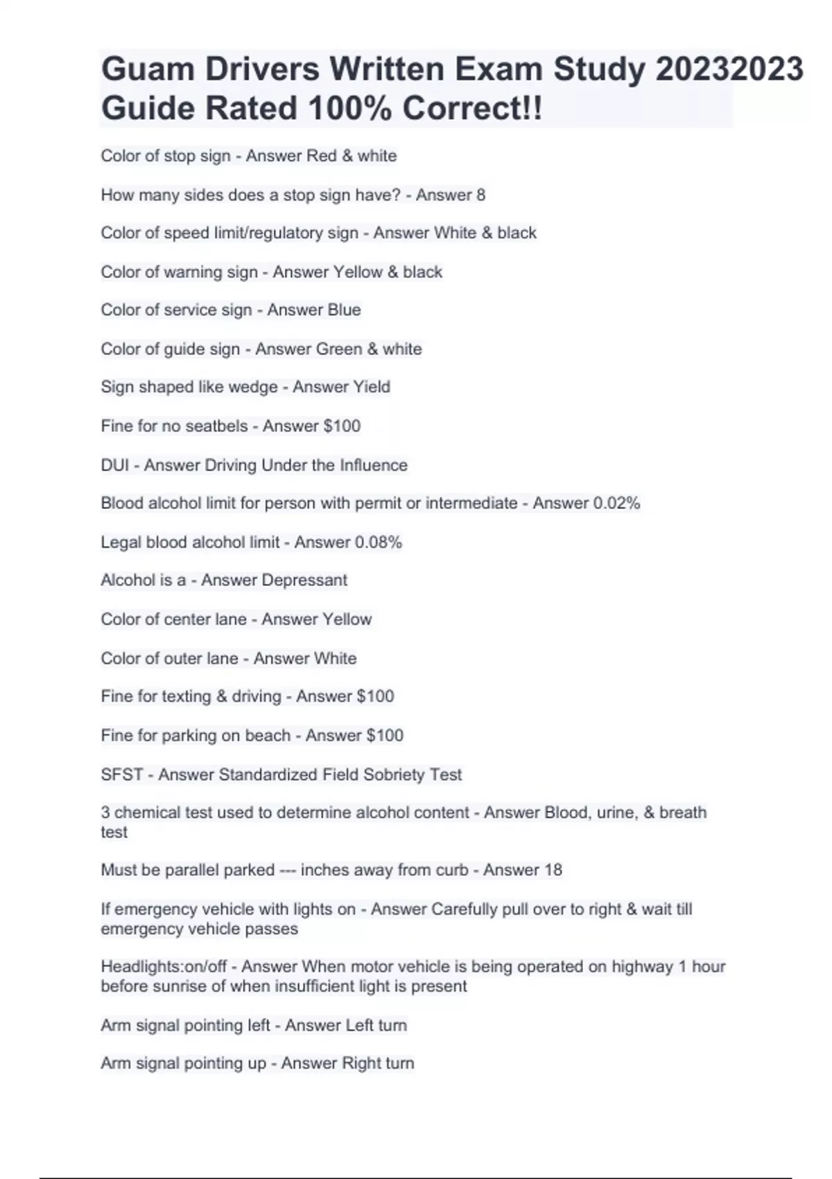 Guam Drivers Written Exam Study 2023 Guide Rated 100% Correct!! Color of stop sign - Answer Red & white How many sides does a stop sign have? - Answer 8 Color of speed limit/regulatory sign - Answer White & black Color of warning sign - Answer Yellow & black Color of service sign - Answer Blue Color of guide sign - Answer Green & white Sign shaped like wedge - Answer Yield Fine for no seatbels - Answer $100 DUI - Answer Driving Under the Influence Blood alcohol limit for person with permit or intermediate - Answer 0.02% Legal blood alcohol limit - Answer 0.08% Alcohol is a - Answer Depressant Color of center lane - Answer Yellow Color of outer lane - Answer White Fine for texting & driving - Answer $100 Fine for parking on beach - Answer $100 SFST - Answer Standardized Field Sobriety Test 3 chemical test used to determine alcohol content - Answer Blood, urine, & breath test Must be parallel parked --- inches away from curb - Answer 18 If emergency vehicle with lights on - Answer Carefully pull over to right & wait till emergency vehicle passes Headlights:on/off - Answer When motor vehicle is being operated on highway 1 hour before sunrise of when insufficient light is present Arm signal pointing left - Answer Left turn Arm signal pointing up - Answer Right turn Guam Drivers Written Exam Study 2023 Guide Rated 100% Correct!! Arm signal pointing down - Answer Stop or slow If pull up to intersection using stop sign - Answer Vehicle to the right HAS right of way If at intersection using stop sign - Answer Vehicle to left must YIELD Highest speed limit on Guam - Answer 35 Driving a motor vehicle on public streets and highways is a... - Answer privilege granted by the territory according to the ruling of the courts What is the minimum age for a person to be entitled for a Guam drivers license? - Answer fifteen years and six months You are driving on a highway. You should know that... - Answer yellow lines separate lanes of traffic moving in opposite directions To avoid being blinded by the headlights of an oncoming vehicle, what should you do? - Answer look to the right hand side of the road Which of the following is correct when driving in a fog? A) Use lower beams and reduce your speed B) Use high beams and reduce your speed C) Use lower beams and increase your speed D) Use high beams and increase your speed - Answer a) use lower beams and reduce your speed How long is a driver's license valid upon arrival on Guam? - Answer thirty days You should never drive when A) You are feeling sick, tired, sleepy, angry or emotionally upset B) Under sedatives or hazardous drugs C) if you've had even one drink D) All of the above - Answer D) all of the above You are about to make a left turn. You must signal continuously during the last ______ feet before the turn - Answer one hundred Speeds in excess of ______ miles per hour shall be unlawful - Answer forty five It is ______ for a person to read, write, or send electronic messages while operating a motor vehicle and shall be punished by a fine not to exceed $______ - Answer unlawful; $100 During heavier rain its advisable to... - Answer turn on your headlights for increased visibility Guam Drivers Written Exam Study 2023 Guide Rated 100% Correct!! If the roadway is wet and your car starts to skid or slide, you should... - Answer slowly take your foot off the accelerator and gradually turn your wheels in the direction of the skid in following another vehicle, you should allow - Answer at least one car length for every ten mph of speed If you approach a school bus with its red lights flashing you should - Answer come to a complete stop and then proceed when the lights are no longer flashing headlights must be used whenever you are driving... - Answer any time there isn't efficient light and from one hour before sunrise You are driving at night and using your high beams. You should dim your lights within 500 feet of: - Answer an oncoming vehicle For which of the following traffic lights must you always stop your vehicle? A)solid red lights, red arrows, flashing yellow lights B) solid red lights, flashing red lights, and blacked out (not working) traffic signals C) Solid red lights, flashing red lights, and yellow lights D) Solid red lights, flashing red lights and yellow arrows - Answer B) solid red lights, flashing red lights, and blacked out (not working) traffic signals Give the right of way to vehicles on the road that you are entering and then proceed when safe to do so - Answer This sign means that you should when should you give the right of way to a pedestrian crossing the road? - Answer give way at all times because pedestrians always have the right of way vehicle registrations are required to be renewed _______ on the month displayed on the sticker located on the top left hand corner of your license plate - Answer annually Every license issued shall expire in _______ (optional_________) after the first anniversary of the date of birth of an applicant occurring after the date of issuance - Answer three years; (optional: five years) A police officer is directing traffic at an intersection and directs you to go through a red light, you should... - Answer go on as directed by the officer when parallel parked, the vehicles right wheels shall be within _______ inches of the curb or edge of the street - Answer eighteen .