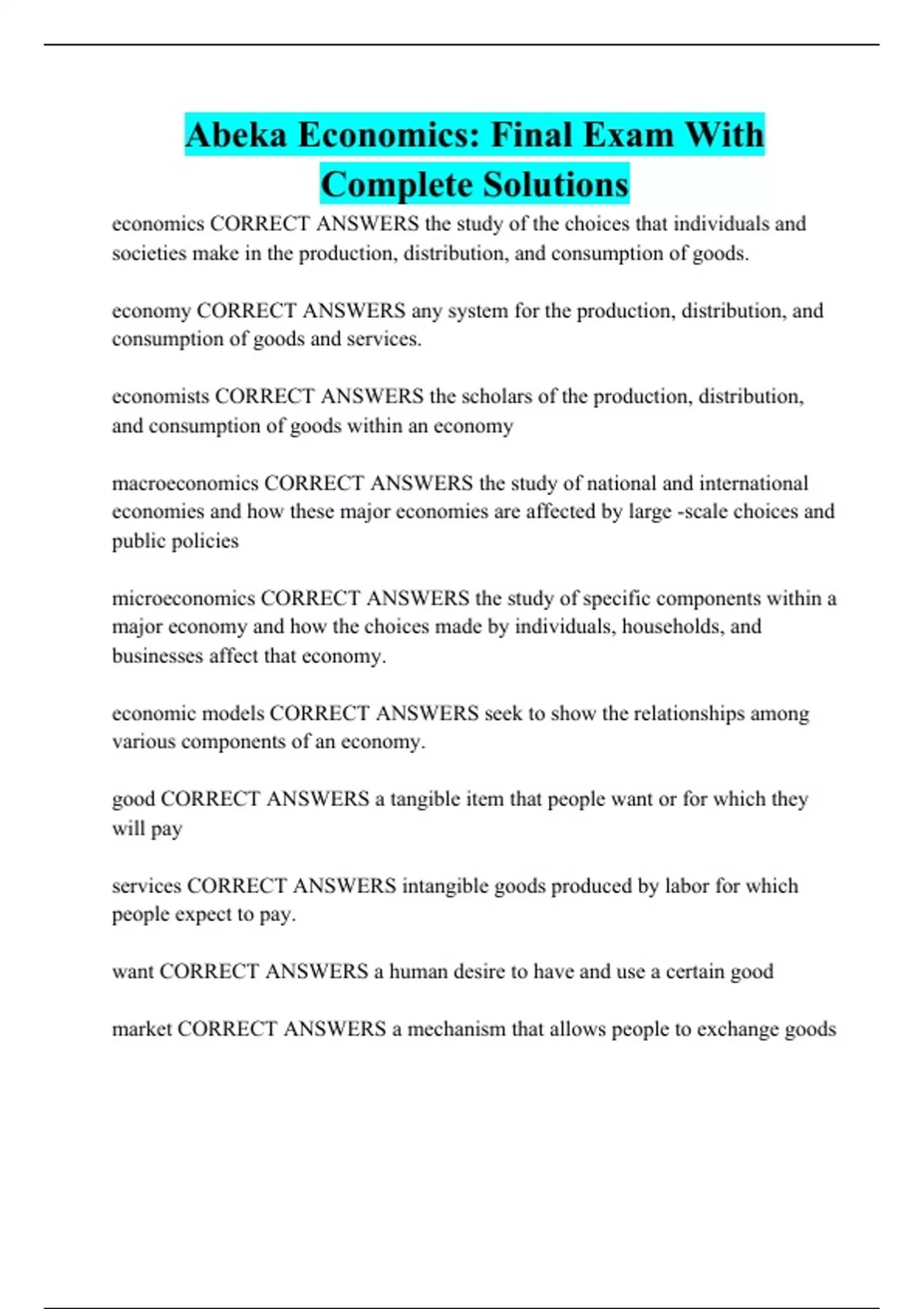 Abeka Economics: Final Exam With Complete Solutions