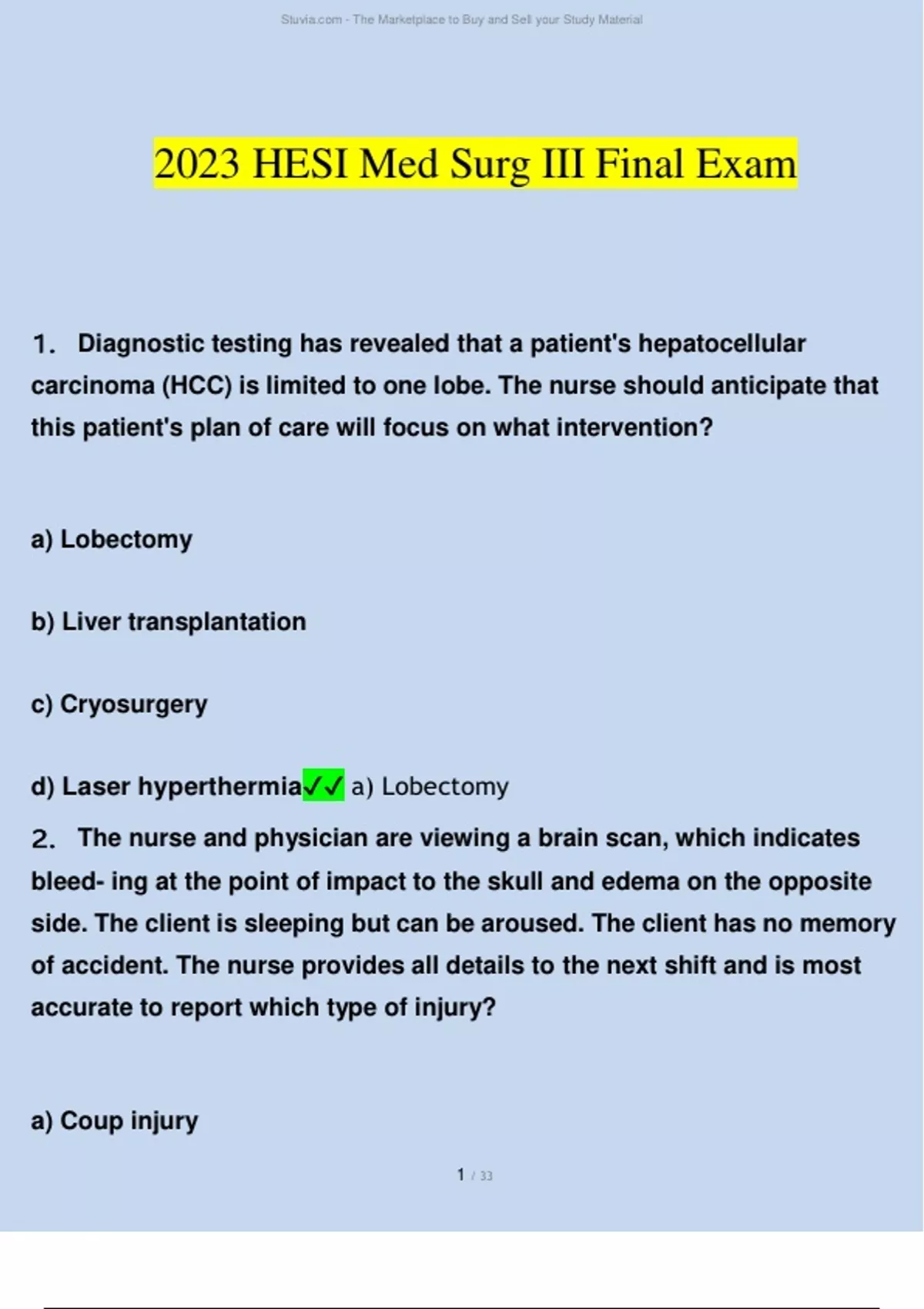 Med Surg III HESI Final Exam 2023 Questions and Answers (Verified Answers) Med Surg III HESI Final Exam 2023 Questions and Answers (Verified Answers)