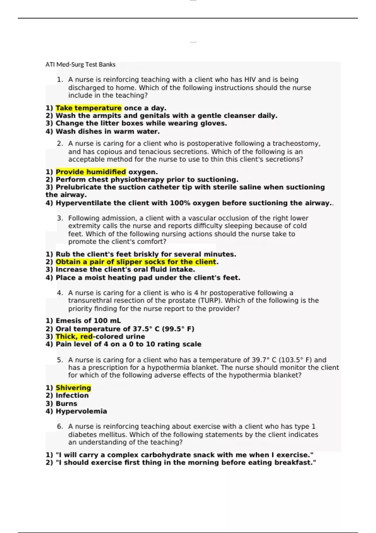 A nurse is reinforcing teaching with a client who has HIV and is being discharged to home. Which of the following instructions should the nurse include in the teaching? A. Take temperature once a day. B. Wash the armpits and genitals with a gentle cleanser daily. C. Change the litter boxes while wearing gloves. D. Wash dishes in warm water. A. A nurse is caring for a client who is postoperative following a tracheostomy, and has copious and tenacious secretions. Which of the following is an acceptable method for the nurse to use to thin this client's secretions? A. Provide humidified oxygen. B. Perform chest physiotherapy prior to suctioning. C. Prelubricate the suction catheter tip with sterile saline when suctioning the airway. D. Hyperventilate the client with 100% oxygen before suctioning the airway.. A.