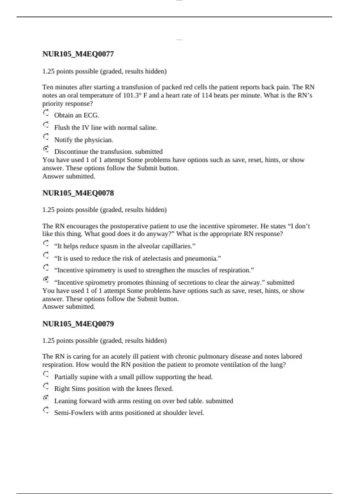 NUR 105/Nursing 105 Exam 2 with answers Ten minutes after starting a transfusion of packed red cells the patient reports back pain. The R N notes an oral temperature of 101.3° F and a heart rate of 114 beats per minute. What is the RN’s pr...
