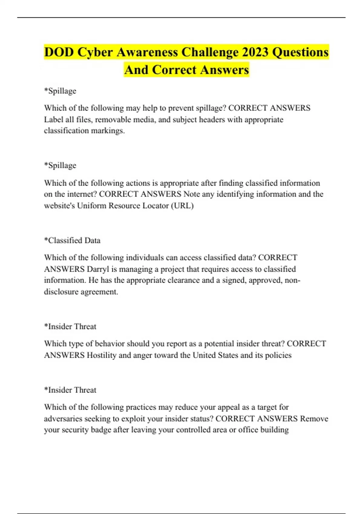 DOD Cyber Awareness Challenge 2023 Questions And Correct Answers