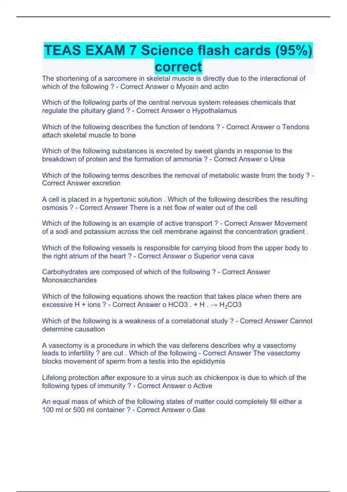 The shortening of a sarcomere in skeletal muscle is directly due to the interactional of which of the following ? - Correct Answer o Myosin and actin Which of the following parts of the central nervous system releases chemicals that regulate the pituitary gland ? - Correct Answer o Hypothalamus Which of the following describes the function of tendons ? - Correct Answer o Tendons attach skeletal muscle to bone Which of the following substances is excreted by sweet glands in response to the breakdown of protein and the formation of ammonia ? - Correct Answer o Urea Which of the following terms describes the removal of metabolic waste from the body ? - Correct Answer excretion A cell is placed in a hypertonic solution . Which of the following describes the resulting osmosis ? - Correct Answer There is a net flow of water out of the cell Which of the following is an example of active transport ? - Correct Answer Movement of a sodi and potassium across the cell membrane against the concentration gradient . Which of the following vessels is responsible for carrying blood from the upper body to the right atrium of the heart ? - Correct Answer o Superior vena cava Carbohydrates are composed of which of the following ? - Correct Answer Monosaccharides Which of the following equations shows the reaction that takes place when there are excessive H + ions ? - Correct Answer o HCO3 . + H . → H₂CO3 Which of the following is a weakness of a correlational study ? - Correct Answer Cannot determine causation A vasectomy is a procedure in which the vas deferens describes why a vasectomy leads to infertility ? are cut . Which of the following - Correct Answer The vasectomy blocks movement of sperm from a testis into the epididymis Lifelong protection after exposure to a virus such as chickenpox is due to which of the following types of immunity ? - Correct Answer o Active An equal mass of which of the following states of matter could completely fill either a 100 ml or 500 ml container ? - Correct Answer o Gas