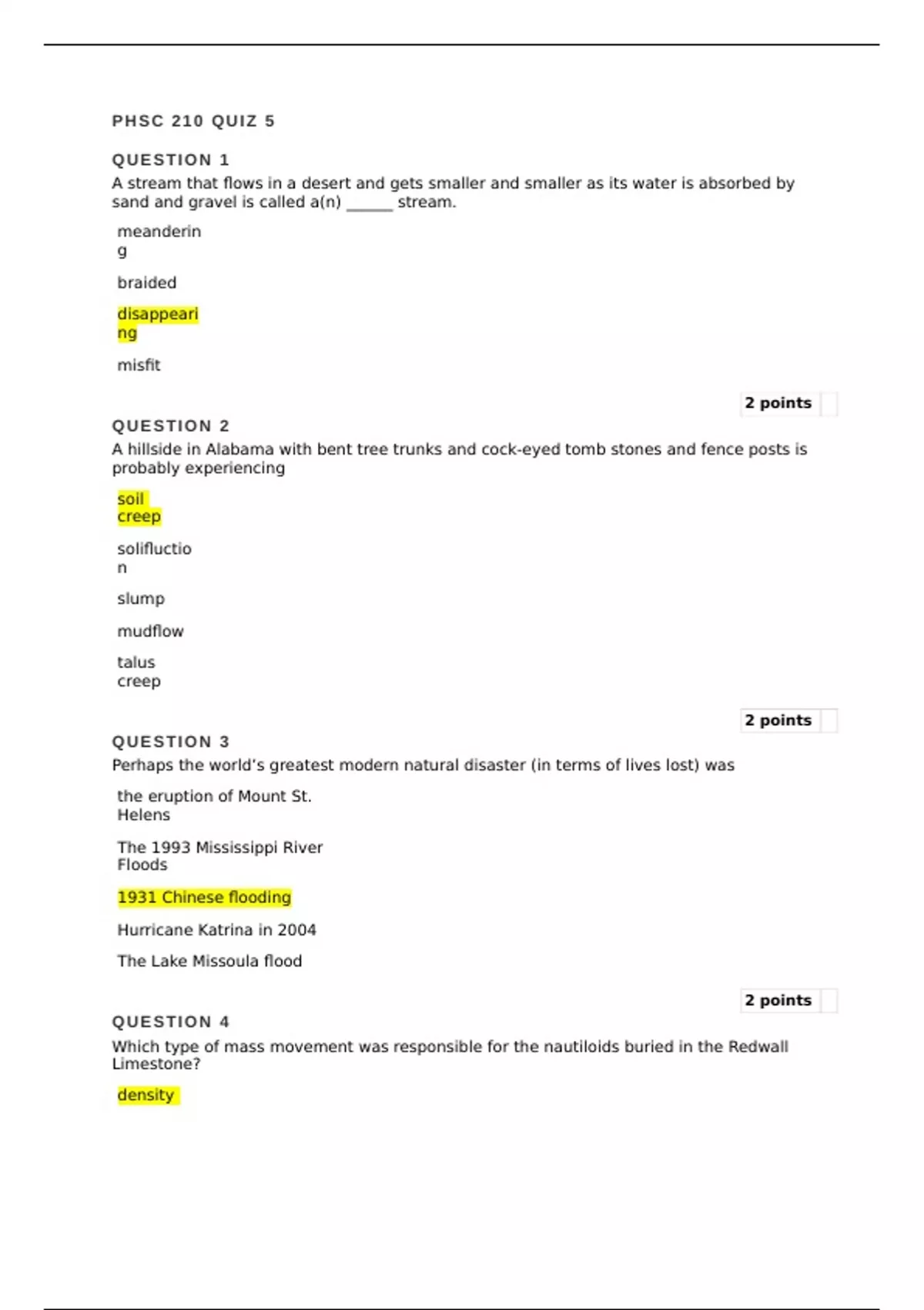 PHSC 210 Quiz 5 Liberty University Complete Answers QUESTION 1 A stream that flows in a desert and gets smaller and smaller as its water is absorbed by sand and gravel is called a(n) ______ stream. meandering braided disappearing misfit 2 points QUESTION 2 A hillside in Alabama with bent tree trunks and cock-eyed tomb stones and fence posts is probably experiencing soil creep solifluction slump mudflow talus creep 2 points QUESTION 3 Perhaps the world’s greatest modern natural disaster (in terms of lives lost) was the eruption of Mount St. Helens The 1993 Mississippi River Floods 1931 Chinese flooding Hurricane Katrina in 2004 The Lake Missoula flood 2 points QUESTION 4 Which type of mass movement was responsible for the nautiloids buried in the Redwall Limestone? density current mudflow debris flow debris avalanche lahar 2 points QUESTION 5 The most common rock type for the formation of karst features is sandstone granite shale conglomerate limestone 2 points QUESTION 6 The most powerful and rapid stream erosion process is cavitation solution by carbonic acid abrasion hydraulic action sapping 2 points QUESTION 7 If your house is built on a hillside susceptible to past mass wasting events, the most important thing you could do reduce the risk of further movement would be cut terraces in the slope above you install good drainage build a cement wall upslope of your home plant more vegetation on the hillside remove all the vegetation on the hillside to promote rapid drainage 2 points QUESTION 8 Sand is usually found in the ______ load of a stream bed dissolved load suspended load 2 points QUESTION 9 Which mineral is produced when rocks “rust?” calcite hematite chlorite halite apatite 2 points QUESTION 10 A layer of rock that is impermeable and traps a pool of water above it is called a(n) water table aquifer aquiclude aeration 2 points QUESTION 11 Deposits made along the sides of a stream channel during periods of flooding are called alluvial fans deltas natural levees flood plains gravel bars 2 points QUESTION 12 It is observed in the desert of southern California that a mountainside made of granite has both many joints and rounded granite boulders. This would be an example of differential weathering spheroidal weathering the action of carbonic acid evidence of talus creep evidence of groundwater sapping 2 points QUESTION 13 This type of cave formation often has a very strange shape stalactite soda straw stalagmite helictite flowstone 2 points QUESTION 14 This type of process might cause a door to your house not to open very well in the winter time. frost wedging frost heaving groundwater sapping unloading pressure release 2 points QUESTION 15 This type of thermal feature is formed as hot water encounters volcanic ash as it rises to the surface geyser mud pot fumarole hot spring kimberlite 2 points QUESTION 16 Calcite (or limestone) exposed at the earth’s surface is commonly weathered by hydrochloric acid phosphoric acid hydraulic acid sulfuric acid carbonic acid 2 points QUESTION 17 Which one of the following horizons would probably have the most mineral matter? “A” “B” “C” “O” “E” 2 points QUESTION 18 When a well is heavily pumped the water table forms a capillary fringe the aquifer becomes an aquiclude the water table drops forming a funnel-shape nothing happens to the water table level the bottom of the aquifer rises, forming a cone of ascension 2 points QUESTION 19 Weathering is the physical removal and transport of material from a slope. True False 2 points QUESTION 20 Soda straws are a special type of stalactite. True False 2 points QUESTION 21 There is evidence that mountain-sized mass movements occurred soon after Noah’s Flood. True False 2 points QUESTION 22 It is likely the Tigris and Euphrates Rivers mentioned in Genesis 2 are the same Tigris and Euphrates Rivers of today. True False 2 points QUESTION 23 Limestone (or other carbonate rock) can be expected immediately below the surface of an area with karst topography. True False 2 points QUESTION 24 Weathering is an important process in the formation of soils. True False 2 points QUESTION 25 Nutrient rich soils would be expected in tropical climates with great amounts of rainfall. True Fals