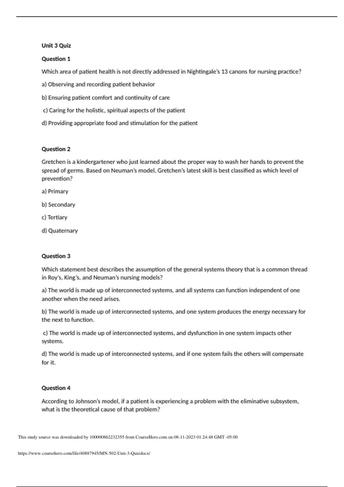 MN 502 Unit 3 Quiz Question 1 Which area of patient health is not directly addressed in Nightingale’s 13 canons for nursing practice? a) Observing and recording patient behavior b) Ensuring patient comfort and continuity of care c) Caring for the holistic, spiritual aspects of the patient d) Providing appropriate food and stimulation for the patient Question 2 Gretchen is a kindergartener who just learned about the proper way to wash her hands to prevent the spread of germs. Based on Neuman’s model, Gretchen’s latest skill is best classified as which level of prevention? a) Primary b) Secondary c) Tertiary d) Quaternary Question 3 Which statement best describes the assumption of the general systems theory that is a common thread in Roy’s, King’s, and Neuman’s nursing models? a) The world is made up of interconnected systems, and all systems can function independent of one another when the need arises. b) The world is made up of interconnected systems, and one system produces the energy necessary for the next to function. c) The world is made up of interconnected systems, and dysfunction in one system impacts other systems. d) The world is made up of interconnected systems, and if one system fails the others will compensate for it. Question 4 According to Johnson’s model, if a patient is experiencing a problem with the eliminative subsystem, what is the theoretical cause of that problem? a) Emotional factors b) Disease-causing agents c) Environmental factors d) Imbalance in a secondary subsystem Question 5 Which selection most closely matches the definition of the health metaparadigm according to the concepts outlined by Nightingale? a) Independence b) Psychological, social, biological, and physiological interactions c) A positive high-level state that is personally defined d) Being well and using one’s talents well Question 6 According to Neuman’s model, when the amount of energy available to a system exceeds the amount of energy being used by the system, the system is in a state of: a) imbalance. b) decline. c) homeostasis. d) surplus. Question 7 Which statement does not describe one of the three notions Johnson’s model uses to describe the relationship between the person as a behavioral system and the environment? a) Systems impact the environment more than the environment impacts systems. b) Balance is essential for effective and efficient functions. c) Nursing is an external regulatory force that acts to restore balance. d) The system manages its relationship with the environment. Question 8 Which definition of health most closely resembles that proposed by King? a) Health is a continuum of states of wellness and illness. b) Health is a negotiation between a patient and a nurse. c) Health is a goal that everyone strives for throughout their lifetime. d) Health is a process of growth and development in the individual. Question 9 A statement that describes an aspect of Pender’s model would be: a) an external regulatory force that acts to preserve patient behavior at an optimal level. b) the act of raising consciousness of health-promoting behaviors and promoting self-efficacy. c) management of the environment to put patients in the best possible situation for the natural laws of health to act upon them. d) the act of assisting an individual in the performance of activities contributing to health to help him or her gain independence. Question 10 According to Neuman’s model, what is the purpose of outcome identification and planning? a) Synthesizing comprehensive data about a client and a therapy. b) Promoting system stability through energy conservation. c) Determining the effectiveness of client interventions. d) Evaluating the degree to which a client has met his or her goals.
