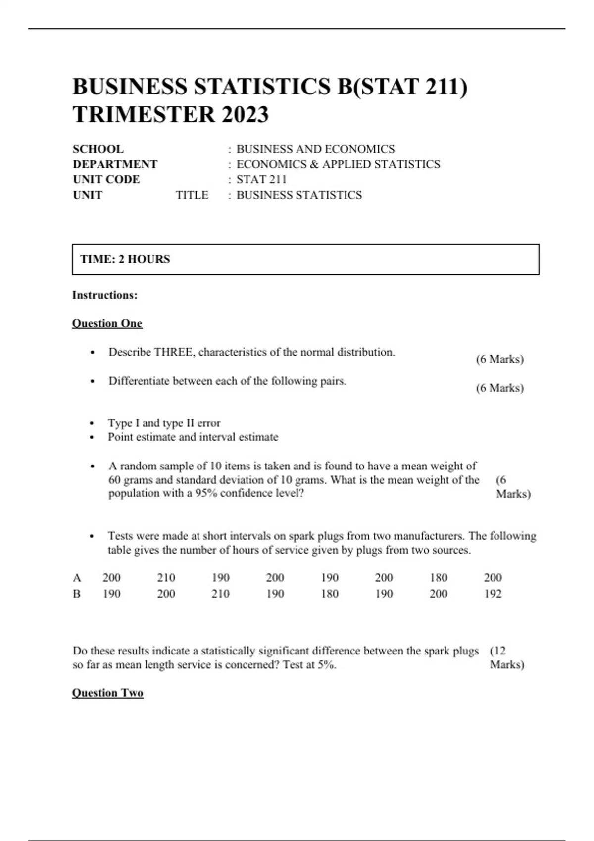 BUSINESS STATISTICS B(STAT 211) TRIMESTER 2023