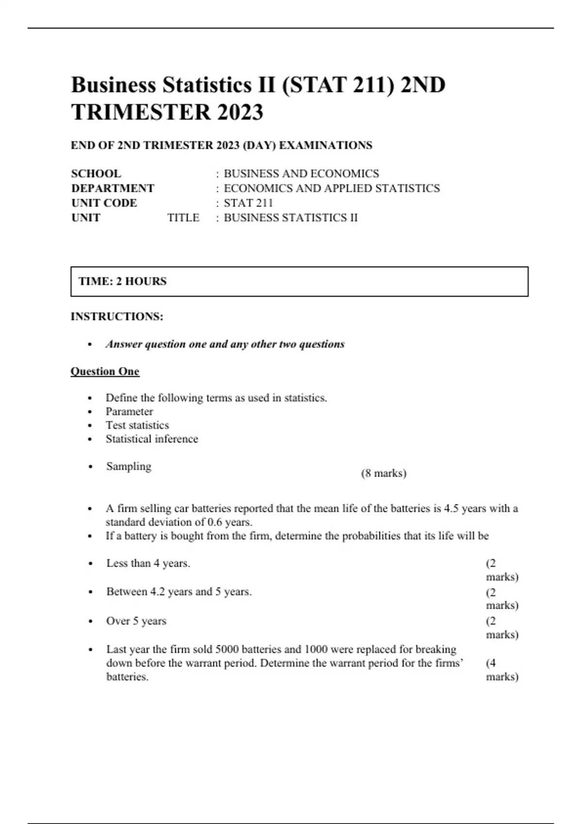 Business Statistics II (STAT 211) 2ND TRIMESTER 2023