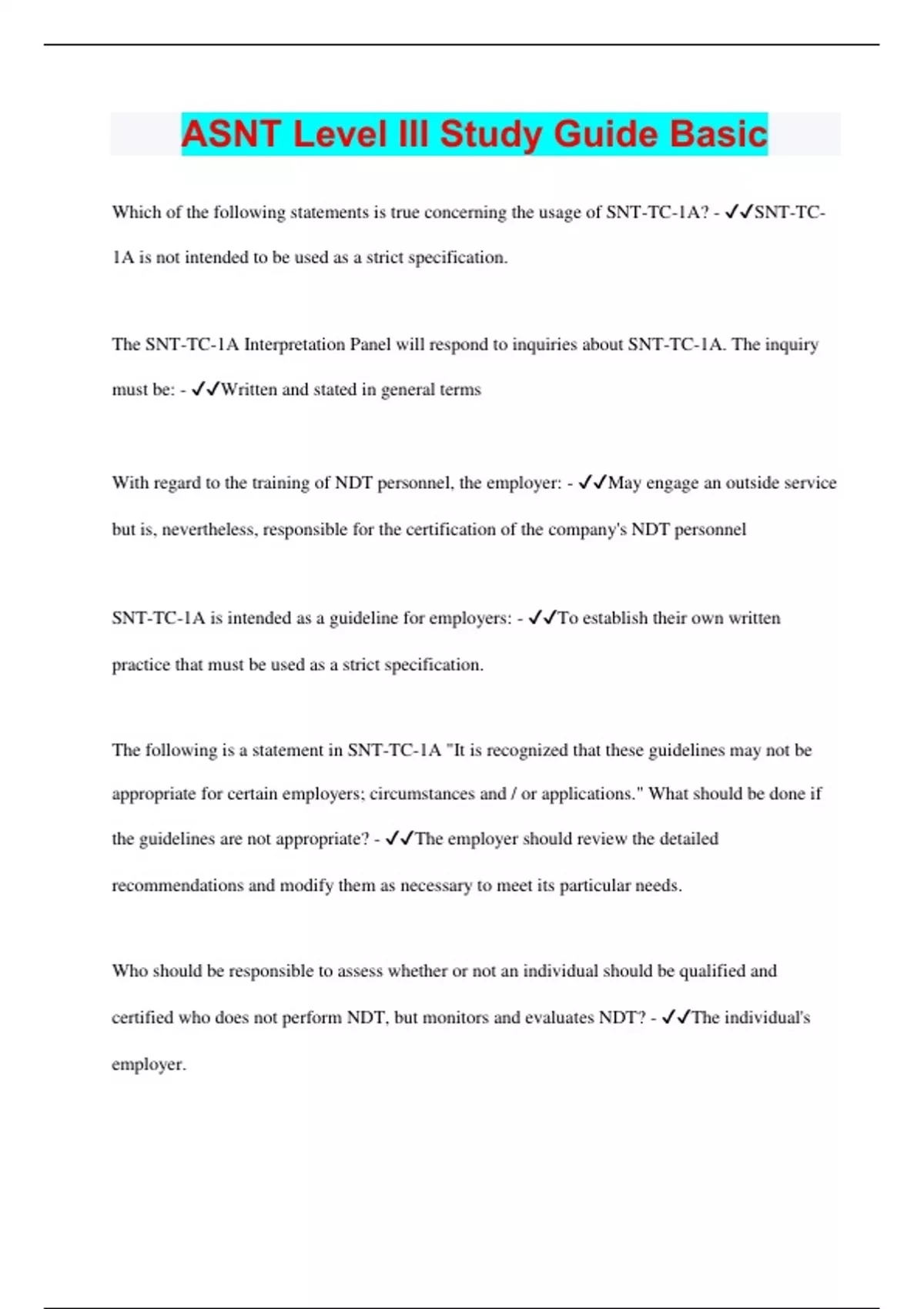 ASNT Level III Study Guide Basic | 2023 | 70 Questions with 100% Correct Answers | Updated & Verified