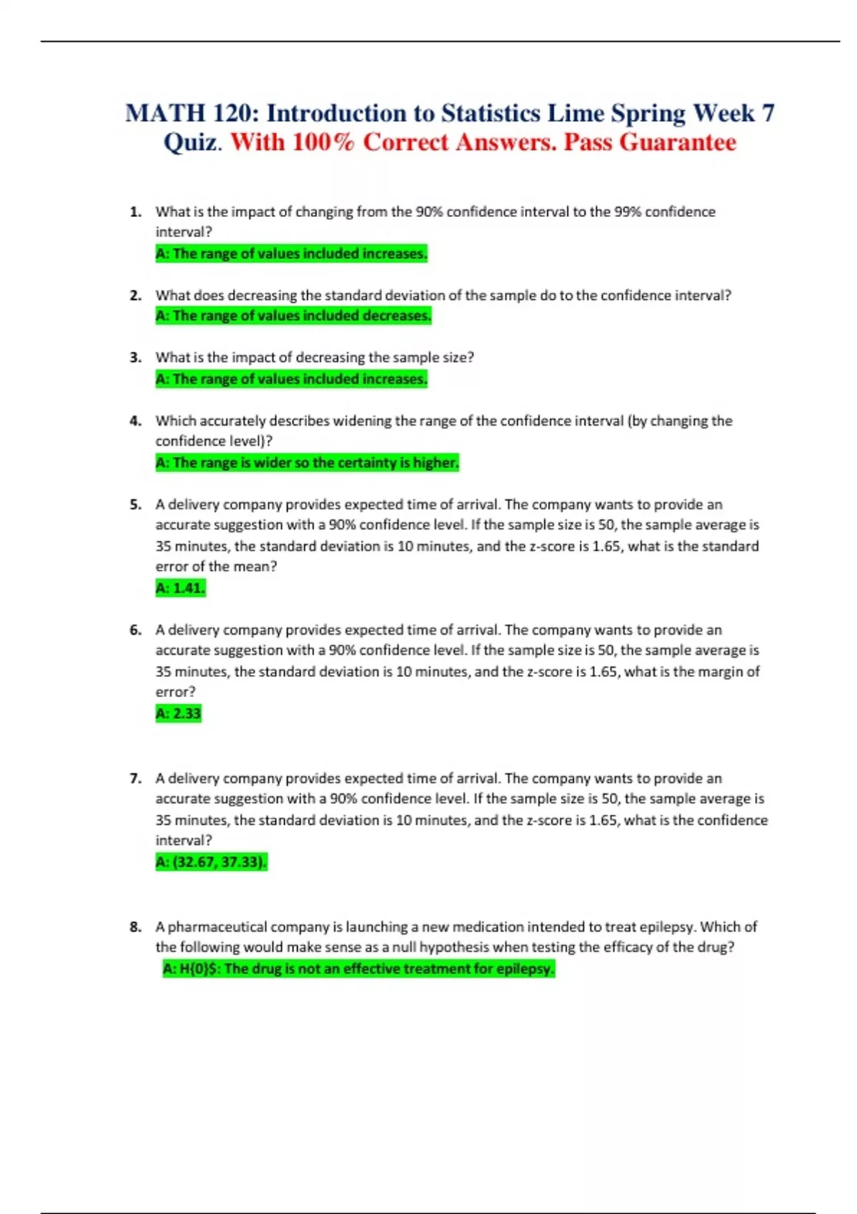 MATH 120: Introduction to Statistics Lime Spring Week 7 Quiz. With 100% Correct Answers. Pass Guarantee 1. What is the impact of changing from the 90% confidence interval to the 99% confidence interval? A: The range of values included increases. 2. What does decreasing the standard deviation of the sample do to the confidence interval? A: The range of values included decreases. 3. What is the impact of decreasing the sample size? A: The range of values included increases. 4. Which accurately describes widening the range of the confidence interval (by changing the confidence level)? A: The range is wider so the certainty is higher.