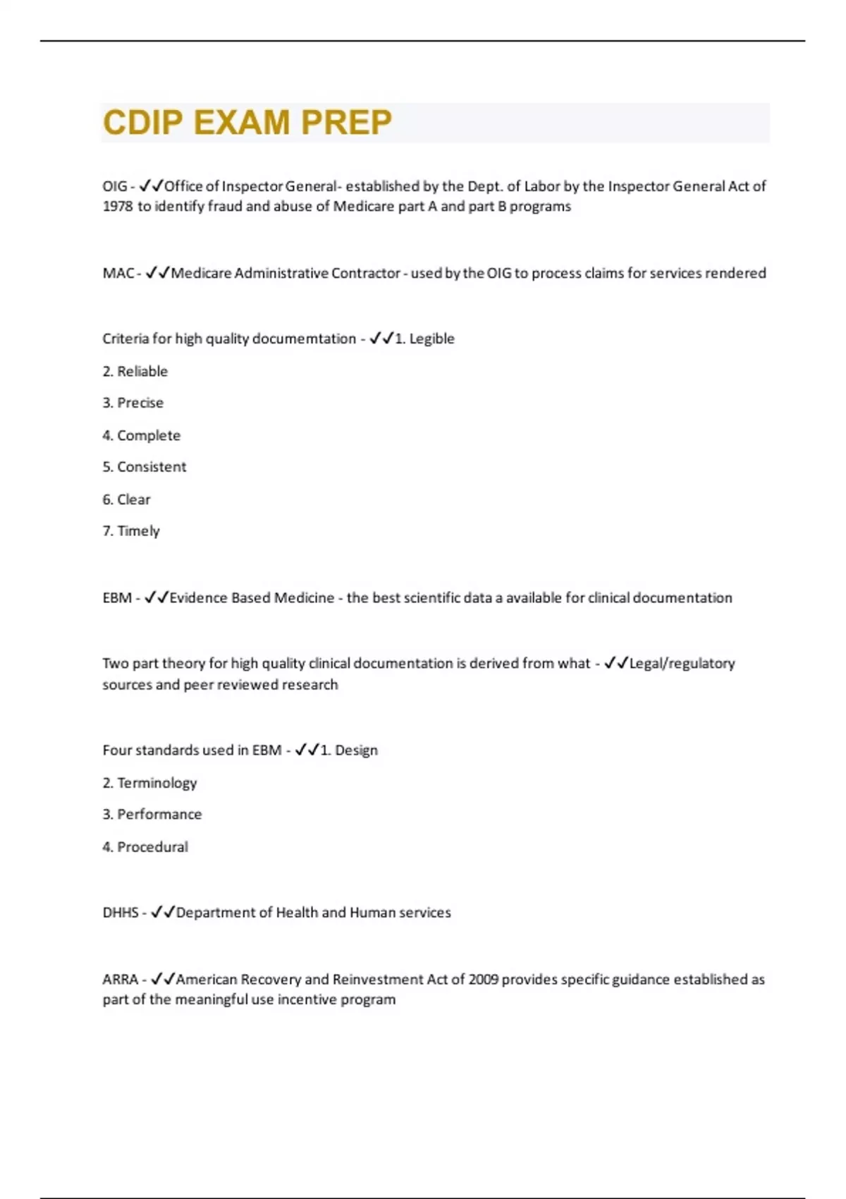 OIG - Office of Inspector General- established by the Dept. of Labor by the Inspector General Act of 1978 to identify fraud and abuse of Medicare part A and part B programs MAC - Medicare Administrative Contractor - used by the OIG to process claims for services rendered Criteria for high quality documemtation - 1. Legible 2. Reliable 3. Precise 4. Complete 5. Consistent 6. Clear 7. Timely EBM - Evidence Based Medicine - the best scientific data a available for clinical documentation Two part theory for high quality clinical documentation is derived from what - Legal/regulatory sources and peer reviewed research Four standards used in EBM - 1. Design 2. Terminology 3. Performance 4. Procedural DHHS - Department of Health and Human services ARRA - American Recovery and Reinvestment Act of 2009 provides specific guidance established as part of the meaningful use incentive programMeaningful use requirements - Provider must maintain an up to date problem list of current and active diagnoses for 80% of patients and 80% of all patients have to have at least one coded problem as opposed to their entire problem list coded IPPS - Hospital Inpatient Prospective Payment System. Reimbursement now being driven by codes assigned to the patient stay with the inception of IPPS in 1982 House Staff - Interns, residents and fellows - physicians in training CMS - Centers for Medicare and Medicaid Services NCHS - National Center for Health Statistics CMS and NCHS created what? - Both departments within DHHS, CMS AND DCHS created the Official guidelines for Coding and Reporting