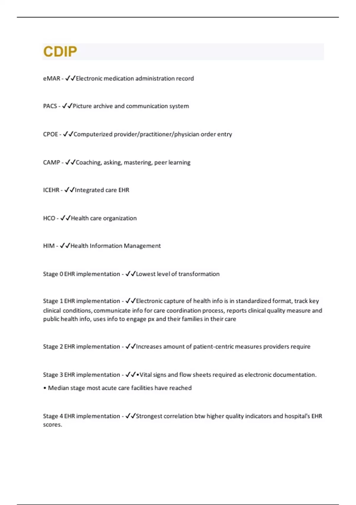 eMAR - Electronic medication administration record PACS - Picture archive and communication system CPOE - Computerized provider/practitioner/physician order entry CAMP - Coaching, asking, mastering, peer learning ICEHR - Integrated care EHR HCO - Health care organization HIM - Health Information Management Stage 0 EHR implementation - Lowest level of transformation Stage 1 EHR implementation - Electronic capture of health info is in standardized format, track key clinical conditions, communicate info for care coordination process, reports clinical quality measure and public health info, uses info to engage px and their families in their care Stage 2 EHR implementation - Increases amount of patient-centric measures providers require Stage 3 EHR implementation - •Vital signs and flow sheets required as electronic documentation. • Median stage most acute care facilities have reached Stage 4 EHR implementation - Strongest correlation btw higher quality indicators and hospital's EHR scores.Hospital has a CPOE system in place along with 2nd level of clinical decision support capabilities related to EBM protocols Stage 5 EHR implementation - HCO fully implements closed loop eMAR environment in at least one patient care area