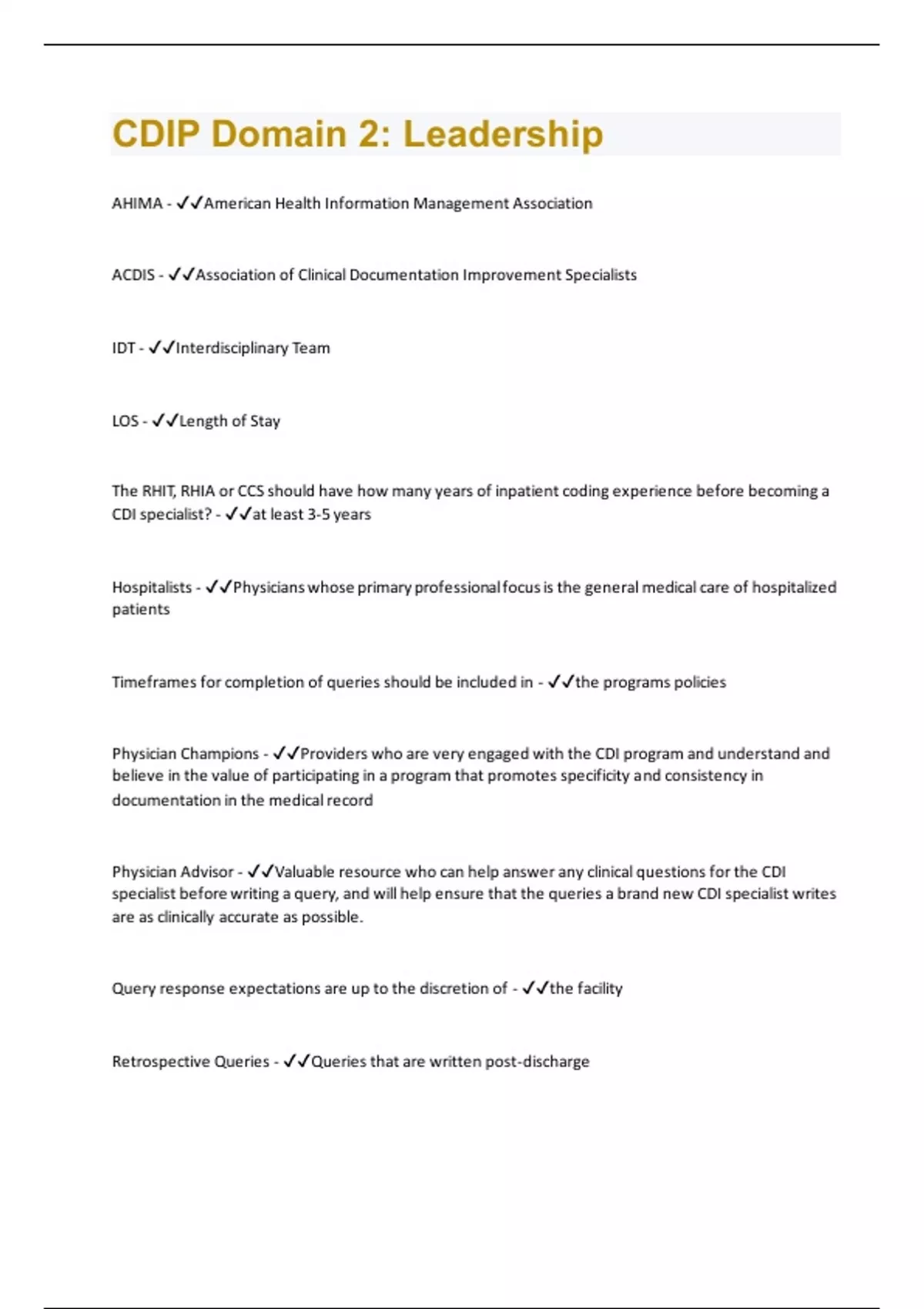 AHIMA - American Health Information Management Association ACDIS - Association of Clinical Documentation Improvement Specialists IDT - Interdisciplinary Team LOS - Length of Stay The RHIT, RHIA or CCS should have how many years of inpatient coding experience before becoming a CDI specialist? - at least 3-5 years Hospitalists - Physicians whose primary professional focus is the general medical care of hospitalized patients Timeframes for completion of queries should be included in - the programs policies Physician Champions - Providers who are very engaged with the CDI program and understand and believe in the value of participating in a program that promotes specificity and consistency in documentation in the medical record Physician Advisor - Valuable resource who can help answer any clinical questions for the CDI specialist before writing a query, and will help ensure that the queries a brand new CDI specialist writes are as clinically accurate as possible. Query response expectations are up to the discretion of - the facility Retrospective Queries - Queries that are written post-discharge