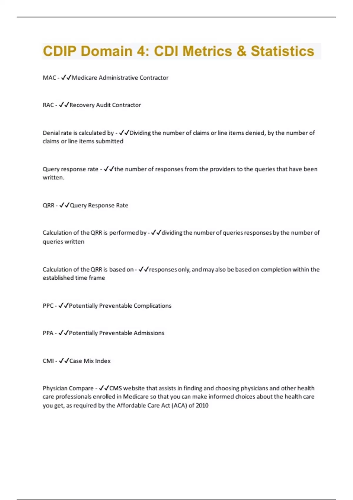 MAC - Medicare Administrative Contractor RAC - Recovery Audit Contractor Denial rate is calculated by - Dividing the number of claims or line items denied, by the number of claims or line items submitted Query response rate - the number of responses from the providers to the queries that have been written. QRR - Query Response Rate Calculation of the QRR is performed by - dividing the number of queries responses by the number of queries written Calculation of the QRR is based on - responses only, and may also be based on completion within the established time frame PPC - Potentially Preventable Complications PPA - Potentially Preventable Admissions CMI - Case Mix Index Physician Compare - CMS website that assists in finding and choosing physicians and other health care professionals enrolled in Medicare so that you can make informed choices about the health care you get, as required by the Affordable Care Act (ACA) of 2010SPS - Safe Practice Score CPOE - Computerized Physician Order Entry EBHR - Evidence-Based Hospital Referral IPS - ICU Physician Staffing HCAHPS - Hospital Consumer Assessment of Healthcare Providers and Systems