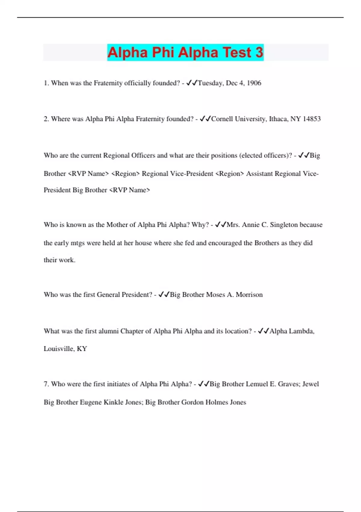 1. When was the Fraternity officially founded? - Tuesday, Dec 4, 1906 2. Where was Alpha Phi Alpha Fraternity founded? - Cornell University, Ithaca, NY 14853 Who are the current Regional Officers and what are their positions (elected officers)? - Big Brother <RVP Name> <Region> Regional Vice-President <Region> Assistant Regional VicePresident Big Brother <RVP Name> Who is known as the Mother of Alpha Phi Alpha? Why? - Mrs. Annie C. Singleton because the early mtgs were held at her house where she fed and encouraged the Brothers as they did their work. Who was the first General President? - Big Brother Moses A. Morrison What was the first alumni Chapter of Alpha Phi Alpha and its location? - Alpha Lambda, Louisville, KY 7. Who were the first initiates of Alpha Phi Alpha? - Big Brother Lemuel E. Graves; Jewel Big Brother Eugene Kinkle Jones; Big Brother Gordon Holmes Jones