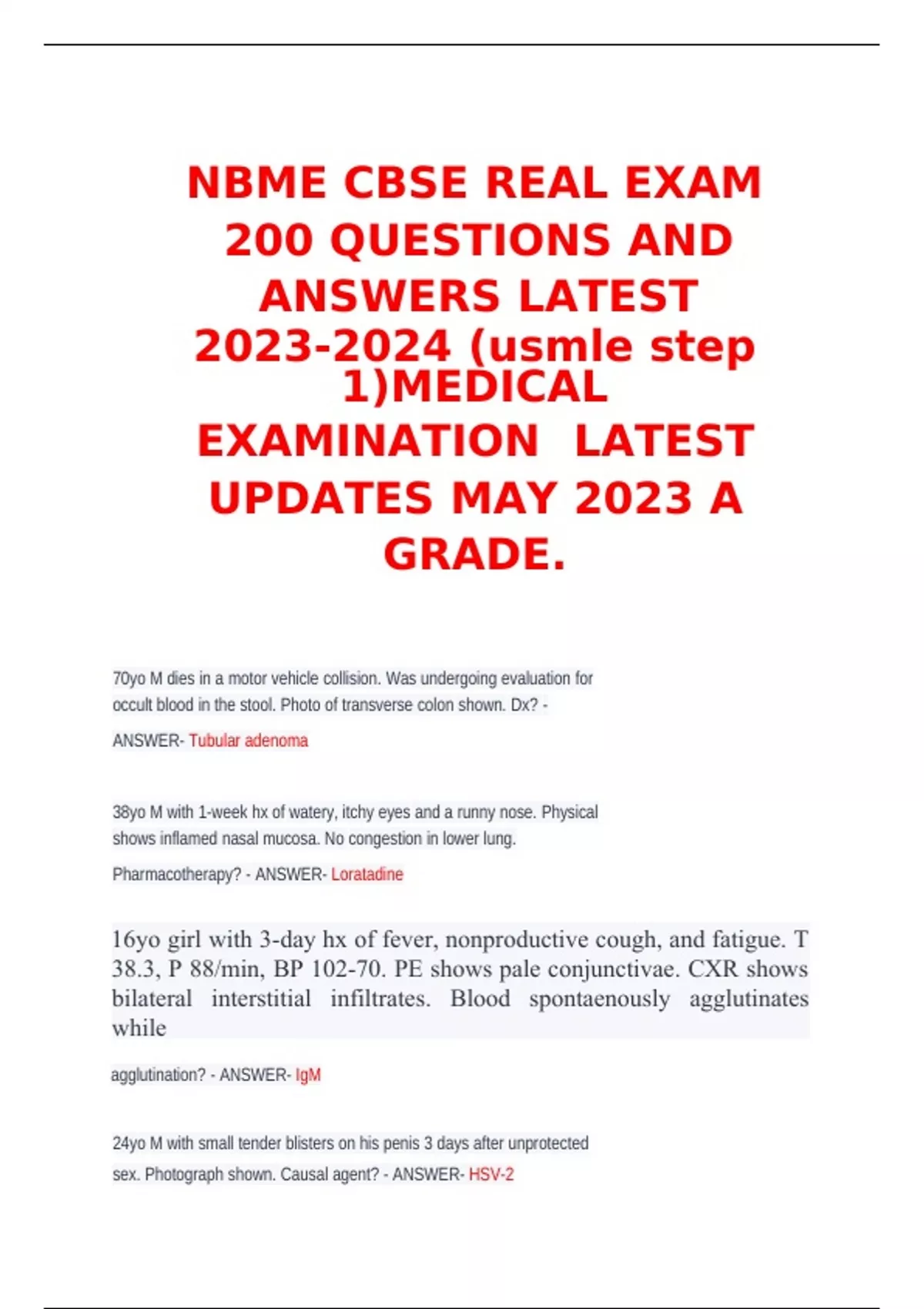 NBME CBSE REAL EXAM 200 QUESTIONS AND ANSWERS LATEST MEDICAL EXAMINATION LATEST UPDATES A GRADE.