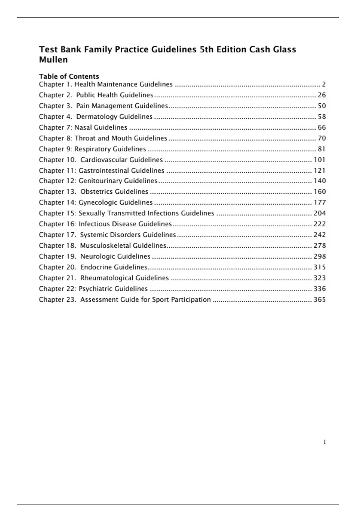 Test Bank Family Practice Guidelines 5th Edition Cash Glass Mullen Table of Contents Chapter 1. Health Maintenance Guidelines ...................................................................... 2 Chapter 2. Public Health Guidelines .............................................................................. 26 Chapter 3. Pain Management Guidelines ....................................................................... 50 Chapter 4. Dermatology Guidelines .............................................................................. 58 Chapter 7: Nasal Guidelines .......................................................................................... 66 Chapter 8: Throat and Mouth Guidelines ....................................................................... 70 Chapter 9: Respiratory Guidelines ................................................................................. 81 Chapter 10. Cardiovascular Guidelines ....................................................................... 101 Chapter 11: Gastrointestinal Guidelines ...................................................................... 121 Chapter 12: Genitourinary Guidelines .......................................................................... 140 Chapter 13. Obstetrics Guidelines .............................................................................. 160 Chapter 14: Gynecologic Guidelines ............................................................................ 177 Chapter 15: Sexually Transmitted Infections Guidelines .............................................. 204 Chapter 16: Infectious Disease Guidelines ................................................................... 222 Chapter 17. Systemic Disorders Guidelines ................................................................. 242 Chapter 18. Musculoskeletal Guidelines ...................................................................... 278 Chapter 19. Neurologic Guidelines ............................................................................. 298 Chapter 20. Endocrine Guidelines ............................................................................... 315 Chapter 21. Rheumatological Guidelines .................................................................... 323 Chapter 22: Psychiatric Guidelines .............................................................................. 336 Chapter 23. Assessment Guide for Sport Participation ................................................ 365 1PREFACE TEST BANK with Complete Questions and Solutions. To clarify, this is the TEST BANK, not the textbook. You get immediate access to download your test bank. You will receive a complete test bank; in other words, all chapters shown in the table of contents in this preview will be there. Test banks come in PDF format; therefore, you do not need specialized software to open them. Chapter 1. Health Maintenance Guidelines Multiple Choice Identify the choice that best completes the statement or answers the question. 1. The nurse is preparing to teach a patient of the Asian culture to perform postoperative dressing changes at home after discharge. Which statement made by the nurse indicates cultural competence? a. Tell me how you feel about your surgery. b. Asian people are smart, so this should be easy for you to understand. c. American surgeons are highly qualified; Im sure you will heal quickly. d. Will you tell me about any traditional healing practices that you would like to use? 2. An unconscious victim of a house fire is brought to the emergency department by the paramedics. Tied to the right wrist is an emblem that appears be a religious talisman. Which action should the nurse take? a. Tape it in place. b. Do nothing with it. c. Remove it and lock it up for safekeeping. d. Place it in a clothing bag with the rest of the patients belongings. 3. A 43-year-old patient of Arab descent is admitted to the hospital. To comply with the state laws of the organization, the nurse offers the patient a Papanicolaou smear, which she refuses. Which action should the nurse take first? a. Notify the physician. b. Report the refusal to the supervisor. c. Explain the rationale for and benefits of the test. d. Tell her it is state law and that she does not have a choice. 4. A patient who is a Jehovahs Witness has severe gastrointestinal bleeding and a dangerously low hemoglobin level. The patient is fully alert and competent and refuses to accept the blood transfusion ordered by the physician. Which action by the nurse is most appropriate? 2a. Obtain a court order to give the blood. b. Administer the blood while the patient is sleeping. c. Have the patients spouse sign the consent to have the blood administered. d. Ensure the patient understands possible consequences and then respect the patients wishes. 5. A patient of Mexican descent sees a curandero for asthma; the curandero has prescribed a special tea to be taken four times a day to open the airways. How should the nurse respond to this situation? a. Encourage the patient to continue drinking the tea. b. Encourage the patient to drink only one cup of the tea each day. c. Ask the patient to bring in the tea package and have the pharmacist check the ingredients. d. Advise the patient to stop drinking the tea because of potential interactions with other medications. 6. The nurse is caring for a young adult male patient who refuses personal care from a female nursing assistant. Which approach by the nurse is best? a. Encourage the patients family to talk with him about his care. b. Have a registered nurse (RN) help with his personal care. c. Assign a male assistant to help with his personal care if one is available. d. Explain to him that males and females take care of both genders in this hospital. 7. The nurse is providing medication instructions to a 45-year-old patient who does not maintain eye contact. What should this patients behavior indicate to the nurse? a. The patient is not interested. b. Th