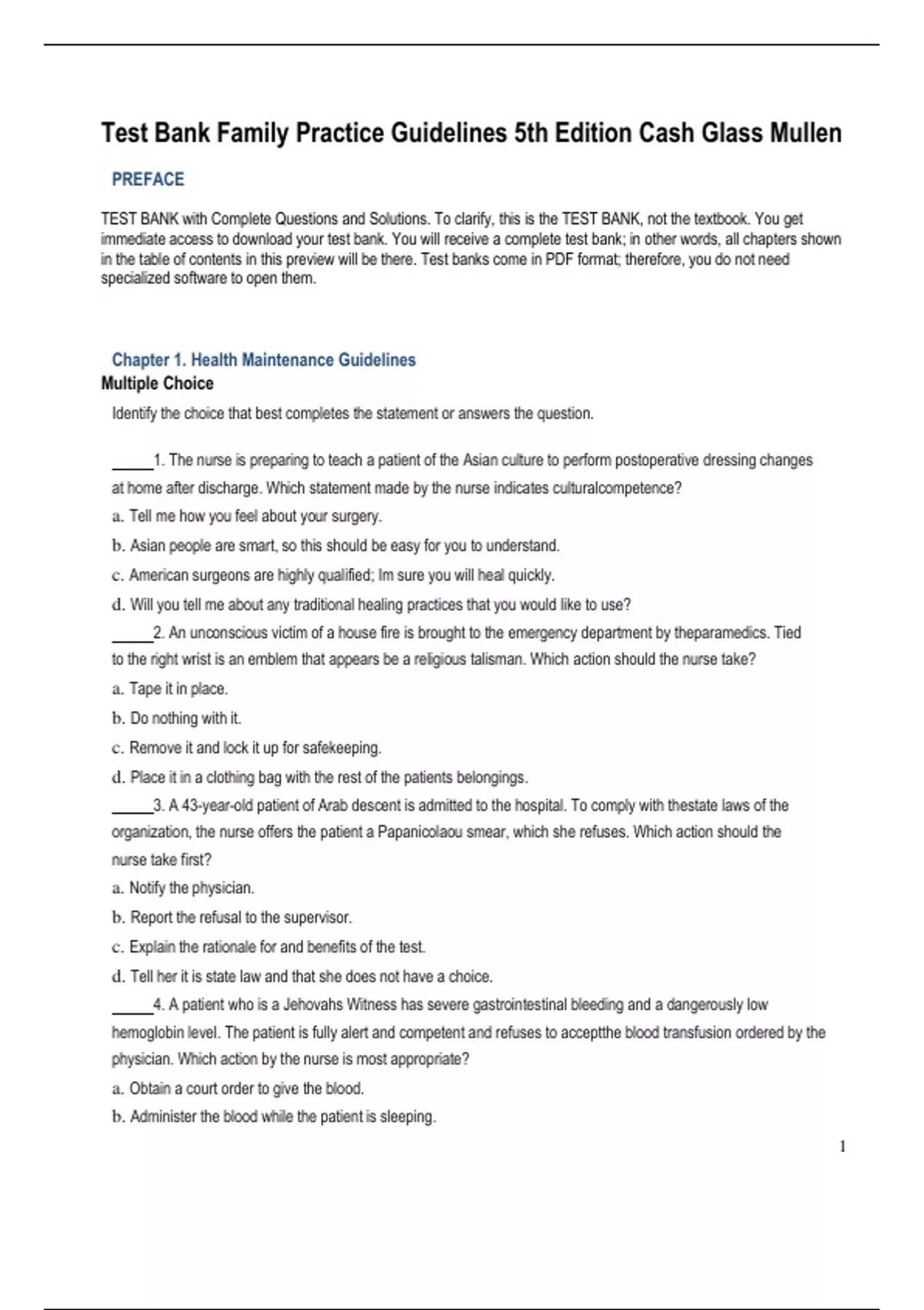 Test Bank Family Practice Guidelines 5th Edition Cash Glass Mullen PREFACE TEST BANK with Complete Questions and Solutions. To clarify, this is the TEST BANK, not the textbook. You get immediate access to download your test bank. You will receive a complete test bank; in other words, all chapters shown in the table of contents in this preview will be there. Test banks come in PDF format; therefore, you do not need specialized software to open them. Chapter 1. Health Maintenance Guidelines Multiple Choice Identify the choice that best completes the statement or answers the question. 1. The nurse is preparing to teach a patient of the Asian culture to perform postoperative dressing changes at home after discharge. Which statement made by the nurse indicates cultural competence? a. Tell me how you feel about your surgery. b. Asian people are smart, so this should be easy for you to understand. c. American surgeons are highly qualified; Im sure you will heal quickly. d. Will you tell me about any traditional healing practices that you would like to use? 2. An unconscious victim of a house fire is brought to the emergency department by the paramedics. Tied to the right wrist is an emblem that appears be a religious talisman. Which action should the nurse take? a. Tape it in place. b. Do nothing with it. c. Remove it and lock it up for safekeeping. d. Place it in a clothing bag with the rest of the patients belongings. 3. A 43-year-old patient of Arab descent is admitted to the hospital. To comply with the state laws of the organization, the nurse offers the patient a Papanicolaou smear, which she refuses. Which action should the nurse take first? a. Notify the physician. b. Report the refusal to the supervisor. c. Explain the rationale for and benefits of the test. d. Tell her it is state law and that she does not have a choice. 4. A patient who is a Jehovahs Witness has severe gastrointestinal bleeding and a dangerously low hemoglobin level. The patient is fully alert and competent and refuses to accept the blood transfusion ordered by the physician. Which action by the nurse is most appropriate? a. Obtain a court order to give the blood. b. Administer the blood while the patient is sleeping. 1c. Have the patients spouse sign the consent to have the blood administered. d. Ensure the patient understands possible consequences and then respect the patients wishes. 5. A patient of Mexican descent sees a curandero for asthma; the curandero has prescribed a special tea to be taken four times a day to open the airways. How should the nurse respond to this situation? a. Encourage the patient to continue drinking the tea. b. Encourage the patient to drink only one cup of the tea each day. c. Ask the patient to bring in the tea package and have the pharmacist check the ingredients. d. Advise the patient to stop drinking the tea because of potential interactions with other medications. 6. The nurse is caring for a young adult male patient who refuses personal care from a female nursing assistant. Which approach by the nurse is best? a. Encourage the patients family to talk with him about his care. b. Have a registered nurse (RN) help with his personal care. c. Assign a male assistant to help with his personal care if one is available. d. Explain to him that males and females take care of both genders in this hospital. 7. The nurse is providing medication instructions to a 45-year-old patient who does not maintain eye contact. What should this patients behavior indicate to the nurse? a. The patient is not interested. b. The nurse threatens the patients ego. c. The nurse is in a hierarchical position. d. The patient does not intend to follow the instructions. 8. The nurse is caring for a patient of Spanish descent who is experiencing pain, but does not speak English. An interpreter is located to help with the assessment. What should the nurse do to facilitate communication with this patient? a. Use hand signals to determine the cause of the pain. b. Ensure the interpreter is not left alone with the patient. c. Maintain eye contact with the patient and the interpreter. d. Use only physical examination data; do not rely on verbal communication. 9. A new mother of Guatemalan descent brings her 10-day-old infant to a clinic for a well- baby checkup. To promote healing, she has a coin taped to the infants umbilicus. What should the nurse do about this situation? a. Teach the mother how to clean the coin daily and reapply it. b. Explain to the mother that the coin is not necessary for healing. c. Tell the mother to remove the coin, because it could cause an infection. d. Teach the mother how to apply a dry sterile dressing in place of the coin. 10. An older patient who follows the Muslim religion is approaching death. The family says the patients bed should be turned toward the opposite wall, so it can face Mecca to ensure an easier passage into the next life. The wall they want the bed to face has wall suction and oxygen, which the patient is using. Which action by the nurse 2is appropriate? a. Get permission from the physician to move the bed. b. Rearrange the furniture to accommodate the request. c. Tell them you will move the bed when the patient is closer to death. d. Tell them it is impossible because of the short tubing on the oxygen and suction. 11. A patient of northern European descent recovering from surgery denies postoperative pain; however, vital signs indicate an elevated pulse and blood pressure. The patient refuses to move in bed. Which nursing action would best ensure comfort and timely discharge? a. Give the pain medicine as prescribed. b. Ask the physician to prescribe the analgesics around the clock. c. Explain that the pain medicine will help prevent complications. d. Respect the patients denial of pain, and do not encourage the pain medicine. 12. A nurse who emigrated from China begins working on a medical unit. The preceptor explains the unit routines, including the medication administr