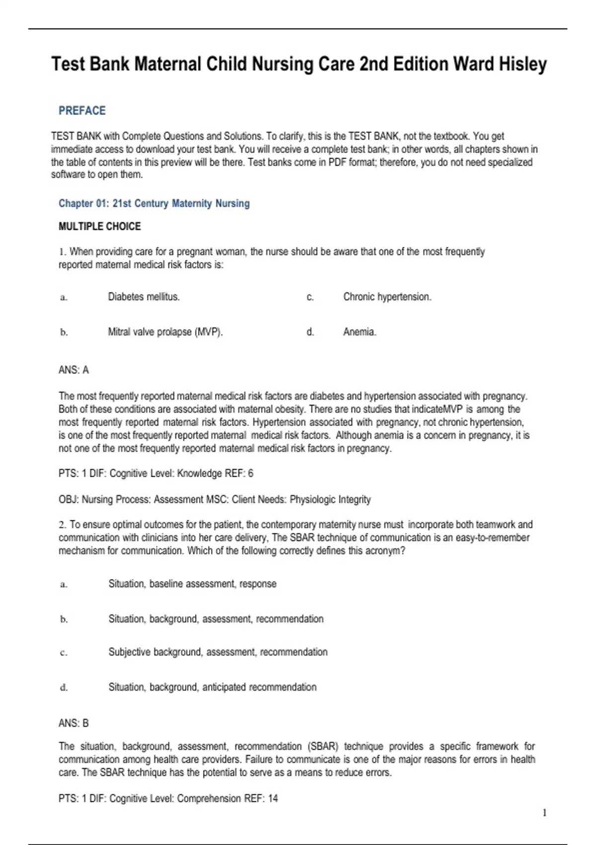 Test Bank Maternal Child Nursing Care 2nd Edition Ward Hisley Chapter 01: 21st Century Maternity Nursing MULTIPLE CHOICE 1. When providing care for a pregnant woman, the nurse should be aware that one of the most frequently reported maternal medical risk factors is: a. Diabetes mellitus. b. ANS: A The most frequently reported maternal medical risk factors are diabetes and hypertension associated with pregnancy. Both of these conditions are associated with maternal obesity. There are no studies that indicate MVP is among the most frequently reported maternal risk factors. Hypertension associated with pregnancy, not chronic hypertension, is one of the most frequently reported maternal medical risk factors. Although anemia is a concern in pregnancy, it is not one of the most frequently reported maternal medical risk factors in pregnancy. PTS: 1 DIF: Cognitive Level: Knowledge REF: 6 OBJ: Nursing Process: Assessment MSC: Client Needs: Physiologic Integrity 2. To ensure optimal outcomes for the patient, the contemporary maternity nurse must incorporate both teamwork and communication with clinicians into her care delivery, The SBAR technique of communication is an easy-to-remember mechanism for communication. Which of the following correctly defines this acronym? a. b. c. d. ANS: B The situation, background, assessment, recommendation (SBAR) technique provides a specific framework for communication among health care providers. Failure to communicate is one of the major reasons for errors in health care. The SBAR technique has the potential to serve as a means to reduce errors. PTS: 1 DIF: Cognitive Level: Comprehension REF: 14 1 Situation, baseline assessment, response Situation, background, assessment, recommendation Subjective background, assessment, recommendation Situation, background, anticipated recommendation Mitral valve prolapse (MVP). c. d. Chronic hypertension. Anemia.OBJ: Nursing Process: Assessment, Planning MSC: Client Needs: Safe and Effective Care Environment 3. The role of the professional nurse caring for childbearing families has evolved to emphasize: a. Providing care to patients directly at the bedside. b. c. d. ANS: C Professional nurses are part of the team of health care providers who collaboratively care for patients throughout the childbearing cycle. Providing care to patients directly at the bedside is one of the nurses tasks; however, it does not encompass the concept of the evolved professional nurse. Throughout the prenatal period, nurses care for women in clinics and physicians offices and teach classes to help families prepare for childbirth. Nurses also care for childbearing families in birthing centers and in the home. Nurses have been critically important in developing strategies to improve the well-being of women and their infants and have led the efforts to implement clinical practice guidelines using an evidence-based approach. Maternity patients have experienced a decreased, rather than an increased, length of stay over the past 2 decades. PTS: 1 DIF: Cognitive Level: Comprehension REF: 1 OBJ: Nursing Process: Implementation MSC: Client Needs: Safe and Effective Care Environment 4. A 23-year-old African-American woman is pregnant with her first child. Based on the statistics for infant mortality, which plan is most important for the nurse to implement? a. Perform a nutrition assessment. b. c. d. ANS: D Consistent prenatal care is the best method of preventing or controlling risk factors associated with infant mortality. Nutritional status is an important modifiable risk factor, but a nutrition assessment is not the most important action a nurse should take in this situation. The patient may need assistance from a social worker at some time during her pregnancy, but a referral to a social worker is not the most important aspect the nurse should address at this time. If the woman has identifiable high-risk problems, her health care may need to be provided by a physician. However, it cannot be assumed that all African-American women have high-risk issues. In addition, advising the woman to see an obstetrician is not the most important aspect on which the nurse should focus at this time, and it is not appropriate for a nurse to advise or manage the type of care a patient is to receive. 2 Refer the woman to a social worker. Advise the woman to see an obstetrician, not a midwife. Explain to the woman the importance of keeping her prenatal care appointments. Primarily hospital care of maternity patients. Practice using an evidence-based approach. Planning patient care to cover longer hospital stays.PTS: 1 DIF: Cognitive Level: Comprehension REF: 6 OBJ: Nursing Process: Planning MSC: Client Needs: Health Promotion and Maintenance 5. During a prenatal intake interview, the nurse is in the process of obtaining an initial assessment of a 21-year- old Hispanic patient with limited English proficiency. It is important for the nurse to: a. Use maternity jargon in order for the patient to become familiar with these terms. b. c. d. ANS: D Nurses contribute to health literacy by using simple, common words; avoiding jargon; and evaluating whether the patient understands the discussion. Speaking slowly and clearly and focusing on what is important increase understanding. Most patient education materials are written at too high a level for the average adult and may not be useful for a client with limited English proficiency. PTS: 1 DIF: Cognitive Level: Application REF: 5 OBJ: Nursing Process: Evaluation MSC: Client Needs: Health Promotion and Maintenance 6. When managing health care for pregnant women at a prenatal clinic, the nurse should recognize that the most significant barrier to access to care is the pregnant womans: a. Age. b. ANS: D The most significant barrier to health care access is the inability to pay for services; this is compounded by the fact that many physicians refuse to care for women who cannot pay. Although adolescent pregnant clients statistically re