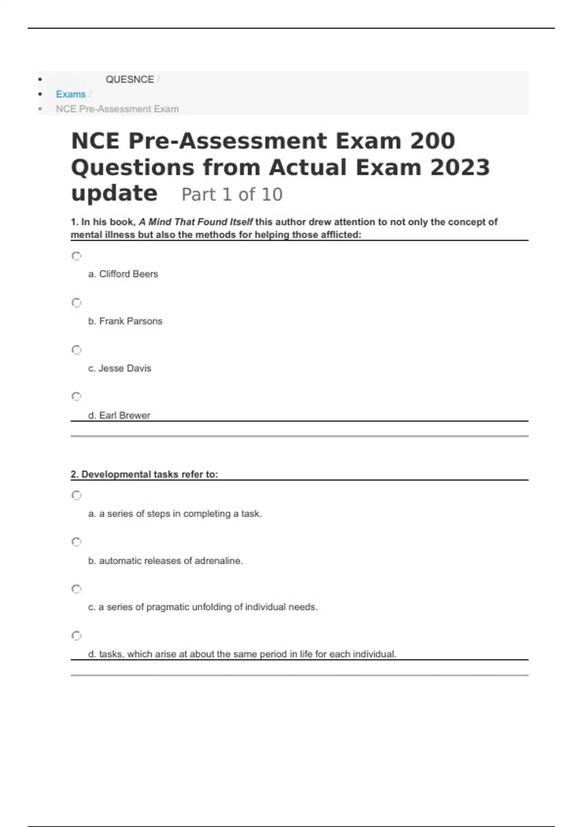 nce pre assessment exam 200 questions from actual
