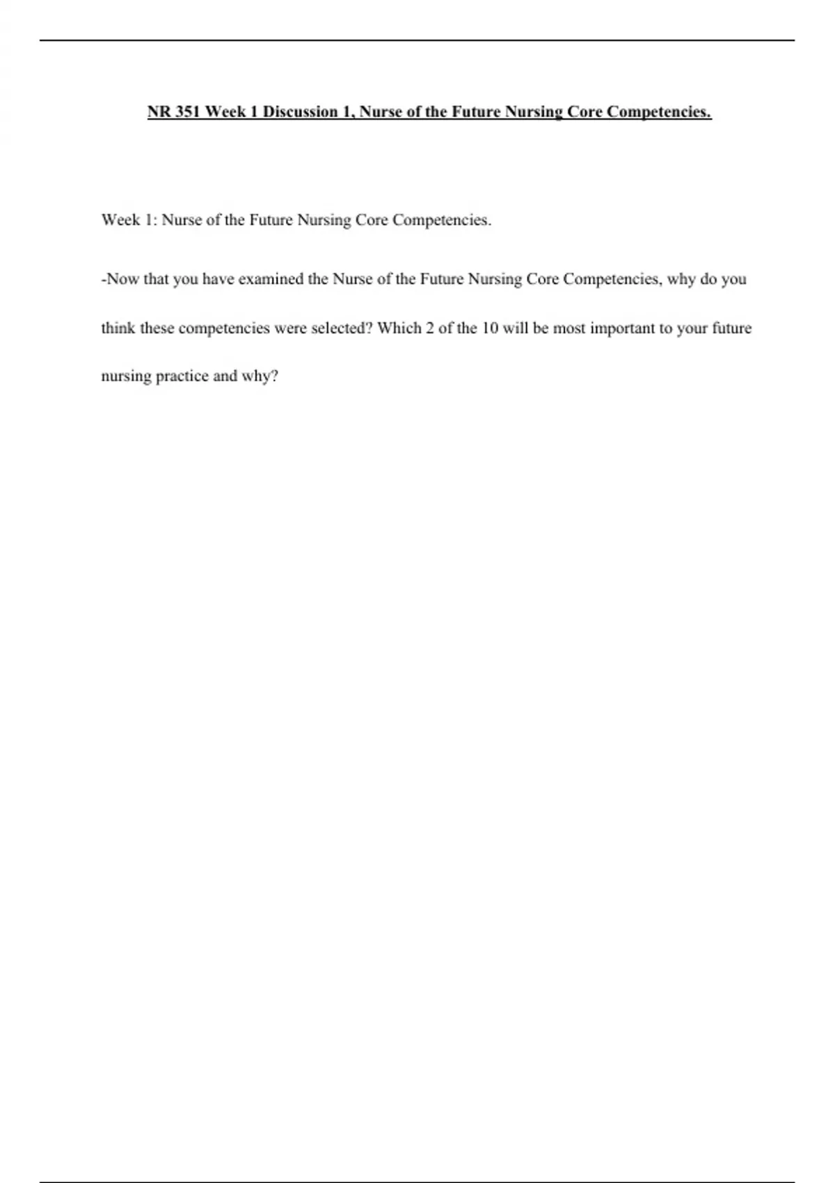 NR 351 Week 1 Discussion 1 Nurse of the Future: Nursing Core Competencies.