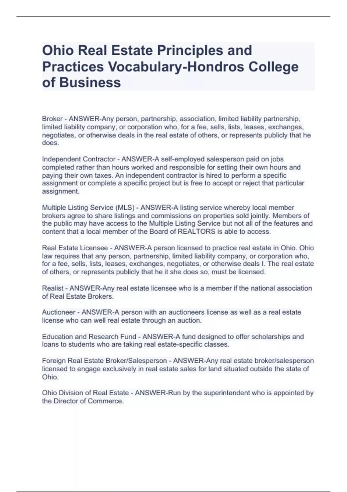 Ohio Real Estate Principles and Practices Vocabulary-Hondros College of BusinessOhio Real Estate Principles and Practices Vocabulary-Hondros College of BusinessOhio Real Estate Principles and Practices Vocabulary-Hondros College of BusinessOhio Real Estate Principles and Practices Vocabulary-Hondros College of Business Broker - ANSWER-Any person, partnership, association, limited liability partnership, limited liability company, or corporation who, for a fee, sells, lists, leases, exchanges, negotiates, or otherwise deals in the real estate of others, or represents publicly that he does. Independent Contractor - ANSWER-A self-employed salesperson paid on jobs completed rather than hours worked and responsible for setting their own hours and paying their own taxes. An independent contractor is hired to perform a specific assignment or complete a specific project but is free to accept or reject that particular assignment. Multiple Listing Service (MLS) - ANSWER-A listing service whereby local member brokers agree to share listings and commissions on properties sold jointly. Members of the public may have access to the Multiple Listing Service but not all of the features and content that a local member of the Board of REALTORS is able to access. Real Estate Licensee - ANSWER-A person licensed to practice real estate in Ohio. Ohio law requires that any person, partnership, limited liability company, or corporation who,