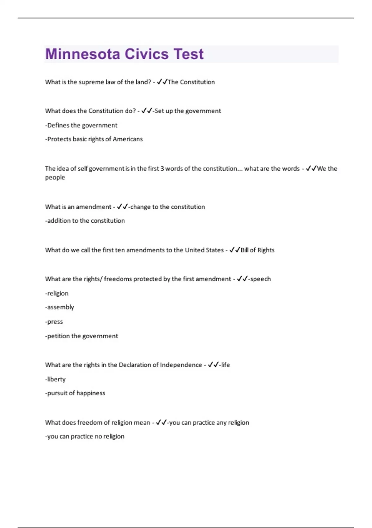 What is the supreme law of the land? - The Constitution What does the Constitution do? - -Set up the government -Defines the government -Protects basic rights of Americans The idea of self government is in the first 3 words of the constitution... what are the words - We the people What is an amendment - -change to the constitution -addition to the constitution What do we call the first ten amendments to the United States - Bill of Rights What are the rights/ freedoms protected by the first amendment - -speech -religion -assembly -press -petition the government What are the rights in the Declaration of Independence - -life -liberty -pursuit of happiness What does freedom of religion mean - -you can practice any religion -you can practice no religionWhat does rule of law mean - -everyone must follow the law -leaders must obey the law -government must obey the law -no one is above the law Branches of the Government - -congress