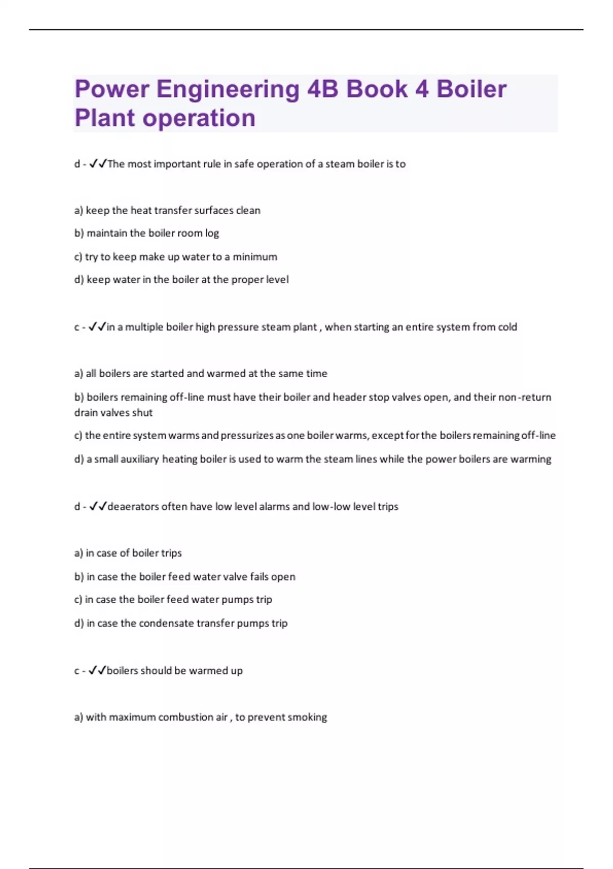 d - The most important rule in safe operation of a steam boiler is to a) keep the heat transfer surfaces clean b) maintain the boiler room log c) try to keep make up water to a minimum d) keep water in the boiler at the proper level c - in a multiple boiler high pressure steam plant , when starting an entire system from cold a) all boilers are started and warmed at the same time b) boilers remaining off-line must have their boiler and header stop valves open, and their non-return drain valves shut c) the entire system warms and pressurizes as one boiler warms, except for the boilers remaining off-line d) a small auxiliary heating boiler is used to warm the steam lines while the power boilers are warming d - deaerators often have low level alarms and low-low level trips a) in case of boiler trips b) in case the boiler feed water valve fails open c) in case the boiler feed water pumps trip d) in case the condensate transfer pumps trip c - boilers should be warmed up a) with maximum combustion air , to prevent smokingb) rapidly, so the metal heats up faster c) slowly, to minimize differential expansion and thermal shock d) using only the pilot burner c - Before performing a try lever test on a power boiler, what pressure should the boiler be at a) the boiler MAWP b) the set pressure of the safety valve c) at least 75% of the set pressure of the safety valve d)at or above 750kPa c - when closing up a boiler a) handhole and manhole gaskets must be coated with a sealant, such as graphite paste or silicone b) handhole and manhole gaskets should be reused , because they are expensive c) new handhole and manhole gaskets must be used, to prevent major blowouts and costly unplanned boiler outages d) handhole and manhole yolks must be torqued until the gaskets are compressed to less than 1mm thick d - On a semi-automatic ignition system, the switch on the supervised cock