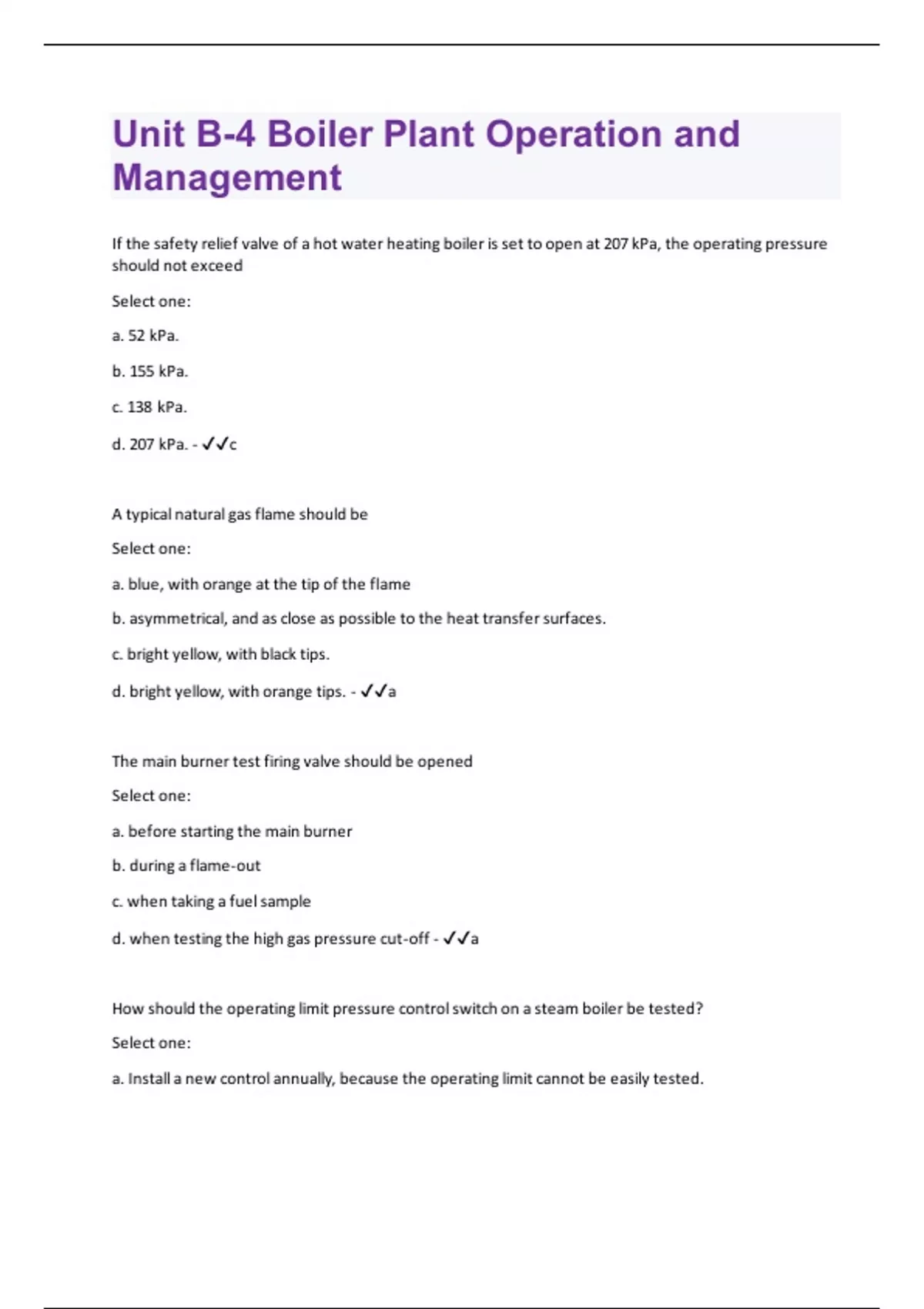 If the safety relief valve of a hot water heating boiler is set to open at 207 kPa, the operating pressure should not exceed Select one: a. 52 kPa. b. 155 kPa. c. 138 kPa. d. 207 kPa. - c A typical natural gas flame should be Select one: a. blue, with orange at the tip of the flame b. asymmetrical, and as close as possible to the heat transfer surfaces. c. bright yellow, with black tips. d. bright yellow, with orange tips. - a The main burner test firing valve should be opened Select one: a. before starting the main burner b. during a flame-out c. when taking a fuel sample d. when testing the high gas pressure cut-off - a How should the operating limit pressure control switch on a steam boiler be tested? Select one: a. Install a new control annually, because the operating limit cannot be easily tested.b. Observe that the boiler cuts in and cuts out during routine boiler operation. c. Remove the control from the boiler and test with a pressure source and a master pressure gauge. d. Jumper the contacts and observe when the boiler shuts off - b