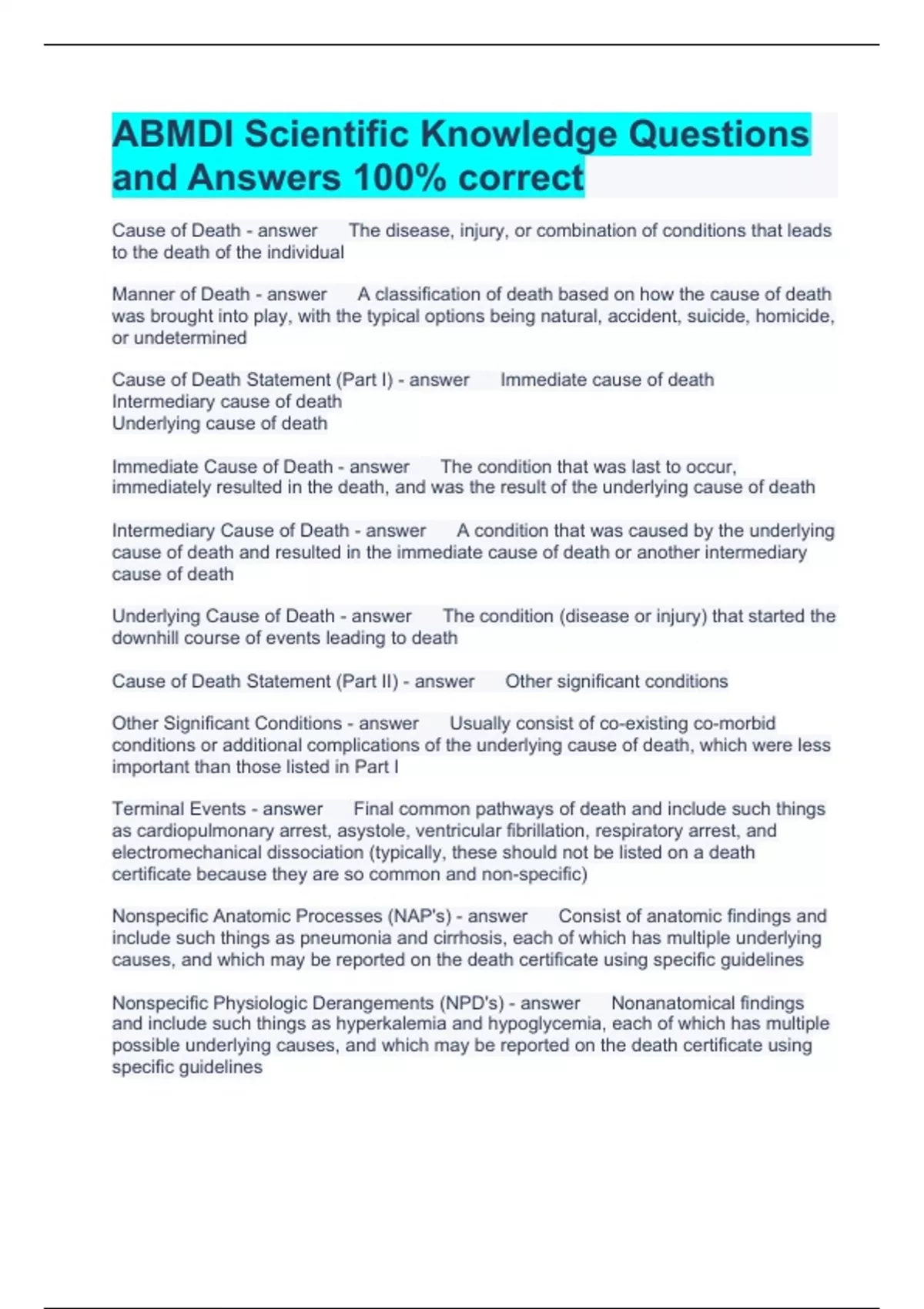 ABMDI Scientific Knowledge Questions and Answers 100% correct Cause of Death The disease, injury, or combination of conditions that leads to the death of the individual Manner of Death A classification of death based on how the cause of death was brought into play, with the typical options being natural, accident, suicide, homicide, or undetermined Cause of Death Statement (Part I) Immediate cause of death Intermediary cause of death Underlying cause of death Immediate Cause of Death The condition that was last to occur, immediately resulted in the death, and was the result of the underlying cause of death Intermediary Cause of Death A condition that was caused by the underlying cause of death and resulted in the immediate cause of death or another intermediary cause of death Underlying Cause of Death The condition (disease or injury) that started the downhill course of events leading to death Cause of Death Statement (Part II) Other significant conditions Other Significant Conditions Usually consist of co-existing co-morbid conditions or additional complications of the underlying cause of death, which were less important than those listed in Part I Terminal Events Final common pathways of death and include such things as cardiopulmonary arrest, asystole, ventricular fibrillation, respiratory arrest, and electromechanical dissociation (typically, these should not be listed on a death certificate because they are so common and non-specific) Nonspecific Anatomic Processes (NAP's) Consist of anatomic findings and include such things as pneumonia and cirrhosis, each of which has multiple underlying causes, and which may be reported on the death certificate using specific guidelines Nonspecific Physiologic Derangements (NPD's) Nonanatomical findings and include such things as hyperkalemia and hypoglycemia, each of which has multiple possible underlying causes, and which may be reported on the death certificate using specific guidelines An individual had insulin dependent diabetes mellitus. He recently obtained cerebral artery arteriosclerosis which caused him to be in a bedridden state from a previous stroke. Because he was bedridden, he obtained infected decubitus ulcers that caused him to obtain systemic sepsis and died. How should the death certificate be written? Part I: a. Systemic sepsis b. Due to: Infected decubitus ulcers c. Due to: Bedridden state from previous stroke d. Due to: Cerebral artery arteriosclerosis Part II: OSC: Insulin dependent diabetes mellitus An individual was a chronic alcoholic who obtained cirrhosis of the liver. He then had ruptured esophageal varices and died. How should the death certificate be written? Part I: a. Ruptured esophageal varices b. Due to: Cirrhosis of the liver c. Due to: Chronic alcoholism d. Due to: Part II: OSC: An individual obtained metastatic carcinoma of the prostate and died. How should the death certificate be written? Part I: a. Metastatic carcinoma of prostate b. Due to: c. Due to: d: Due to: Part II: OSC: An individual had a past medical history of cryptococcal myocarditis. He recently acquired immune deficiency syndrome and obtained pneumocystis carinii pneumonia and died. How should the death certificate be written? Part I: a. Pneumocystis carinii pneumonia b. Due to: Acquired immune deficiency syndrome c. Due to: d. Due to: Part II: OSC: Cryptococcal myocarditis (The myocarditis contributed to the death but did not result in the conditions shown in Part I) An individual was involved in a traffic accident. He was the driver of the vehicle, lost control, went left of the center and was struck head on by a sports utility vehicle. He obtained blunt force trauma of thorax and had an atlanto-occipital dislocation and died. How should the death certificate be written? Part I: a. Atlanto-occipital dislocation b. Due to: Blunt force trauma of the head c. Due to: Collision of motor vehicles d. Due to: Part II: OSC: Blunt force trauma of thorax Manner of Death: Accident How Injury Occurred: Driver of car. Lost control. Went left of center. Struck head-on by sports utility vehicle Algor Mortis Cooling of the body Variables Affecting Algor Mortis: Temperature of body at TOD Environmental temperature Habitus (fat serves as an insulator) Amount of clothing/bedding Rigor Mortis Stiffening of the body Cause of Rigor Mortis: Continued consumption of adenosine triphosphate (ATP) by muscles after death, without concurrent production of ATP Where do you usually first notice rigor mortis? Small muscle groups, then larger groups What accelerates rigor mortis? Any exertion, depleting ATP prior to death (strenuous physical activity, drowning, hyperthermia, certain drugs and poisons) What delays rigor mortis? Cold, diminished musculature Timeline of Rigor Mortis: Begins: 2-4 hours Full: 6-12 hours Gone: Onset of decomposition Livor Mortis Pooling/settling of the blood due to gravity Can livor mortis happen premortem? Yes, it can be premortem in the setting of severe heart failure Timeline of Livor Mortis: Begins: 0.5-2 hours Maximum: 8-12 hours Fixed: 12-18 hours When do you see tardieu spots in livor mortis? When small vessels rupture (18-24 hours), coalescing petechia-like areas "Cherry-Red" Lividity Carbon Monoxied Cyanide Fluoroacetate Cold Temperatures Green Lividity Hydrogen Sulfide What accelerates the fixation of lividity? Heat Sepsis Heart Failure What delays the fixation of lividity? Internal/External Hemorrhage Cold Decomposition Caused by a combination of putrefaction and autolysis; depending on circumstances, one or the other may be the dominant factor Autolysis Digestion of cells and tissues due to intrinsic enzymes and proteins Putrefaction Tissue breakdown as the result of bacterial action Early Decomposition (24-36 Hours) Rigor passes, lividity is fixed Green discoloration to abdomen Marbling Minor purging/Foul-smelling fluid Drying of fingertips/lips Moderate Decomposition (48-72 Hours) Bloating Green-black discoloration of head/neck Signi