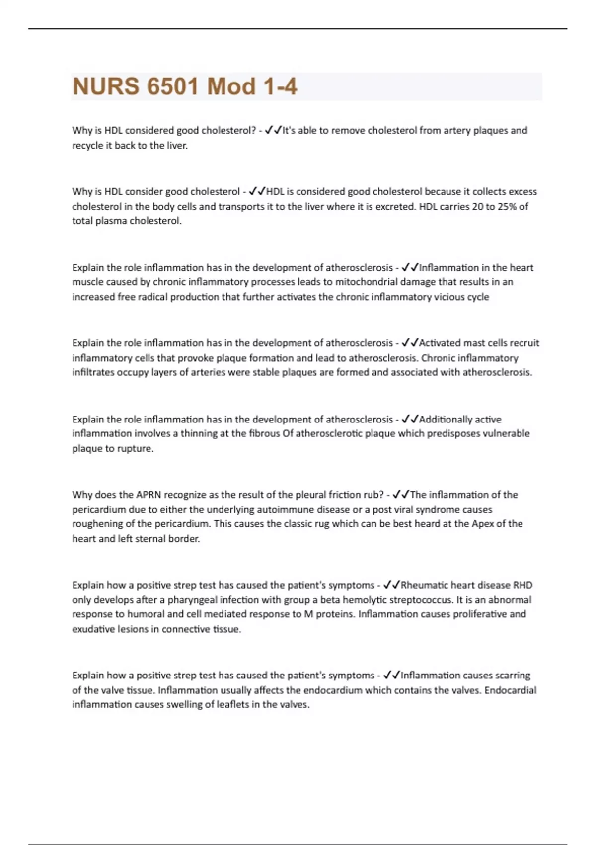 Why is HDL considered good cholesterol? - It's able to remove cholesterol from artery plaques and recycle it back to the liver. Why is HDL consider good cholesterol - HDL is considered good cholesterol because it collects excess cholesterol in the body cells and transports it to the liver where it is excreted. HDL carries 20 to 25% of total plasma cholesterol. Explain the role inflammation has in the development of atherosclerosis - Inflammation in the heart muscle caused by chronic inflammatory processes leads to mitochondrial damage that results in an increased free radical production that further activates the chronic inflammatory vicious cycle Explain the role inflammation has in the development of atherosclerosis - Activated mast cells recruit inflammatory cells that provoke plaque formation and lead to atherosclerosis. Chronic inflammatory infiltrates occupy layers of arteries were stable plaques are formed and associated with atherosclerosis. Explain the role inflammation has in the development of atherosclerosis - Additionally active inflammation involves a thinning at the fibrous Of atherosclerotic plaque which predisposes vulnerable plaque to rupture. Why does the APRN recognize as the result of the pleural friction rub? - The inflammation of the pericardium due to either the underlying autoimmune disease or a post viral syndrome causes roughening of the pericardium. This causes the classic rug which can be best heard at the Apex of the heart and left sternal border. Explain how a positive strep test has caused the patient's symptoms - Rheumatic heart disease RHD only develops after a pharyngeal infection with group a beta hemolytic streptococcus. It is an abnormal response to humoral and cell mediated response to M proteins. Inflammation causes proliferative and exudative lesions in connective tissue. Explain how a positive strep test has caused the patient's symptoms - Inflammation causes scarring of the valve tissue. Inflammation usually affects the endocardium which contains the valves. Endocardial inflammation causes swelling of leaflets in the valves.