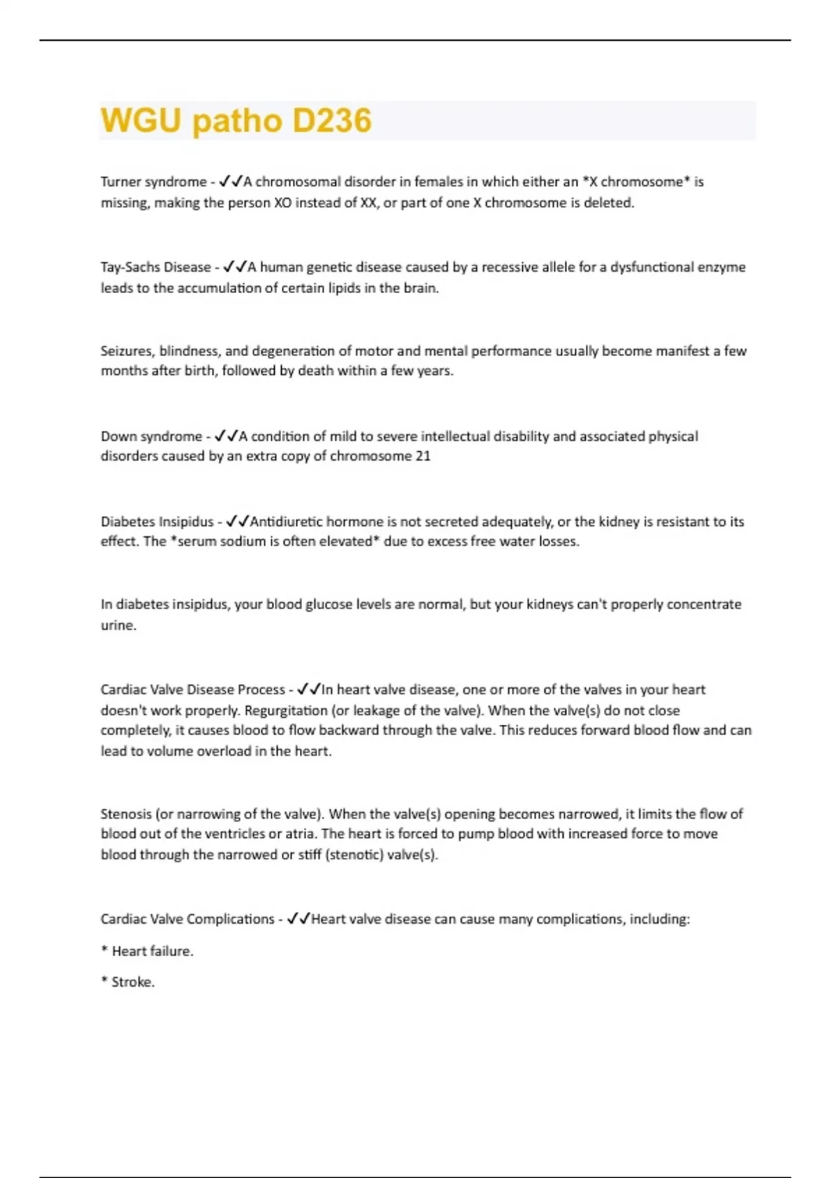 Turner syndrome - A chromosomal disorder in females in which either an *X chromosome* is missing, making the person XO instead of XX, or part of one X chromosome is deleted. Tay-Sachs Disease - A human genetic disease caused by a recessive allele for a dysfunctional enzyme leads to the accumulation of certain lipids in the brain. Seizures, blindness, and degeneration of motor and mental performance usually become manifest a few months after birth, followed by death within a few years. Down syndrome - A condition of mild to severe intellectual disability and associated physical disorders caused by an extra copy of chromosome 21 Diabetes Insipidus - Antidiuretic hormone is not secreted adequately, or the kidney is resistant to its effect. The *serum sodium is often elevated* due to excess free water losses. In diabetes insipidus, your blood glucose levels are normal, but your kidneys can't properly concentrate urine. Cardiac Valve Disease Process - In heart valve disease, one or more of the valves in your heart doesn't work properly. Regurgitation (or leakage of the valve). When the valve(s) do not close completely, it causes blood to flow backward through the valve. This reduces forward blood flow and can lead to volume overload in the heart. Stenosis (or narrowing of the valve). When the valve(s) opening becomes narrowed, it limits the flow of blood out of the ventricles or atria. The heart is forced to pump blood with increased force to move blood through the narrowed or stiff (stenotic) valve(s). Cardiac Valve Complications - Heart valve disease can cause many complications, including: * Heart failure. * Stroke.* Blood clots. * Heart rhythm abnormalities. * Death. Respiratory Illness from bats - *Viral hemorrhagic fevers* are spread by contact with infected animals or insects. The viruses that cause viral hemorrhagic fevers live in a variety of animal and insect hosts.