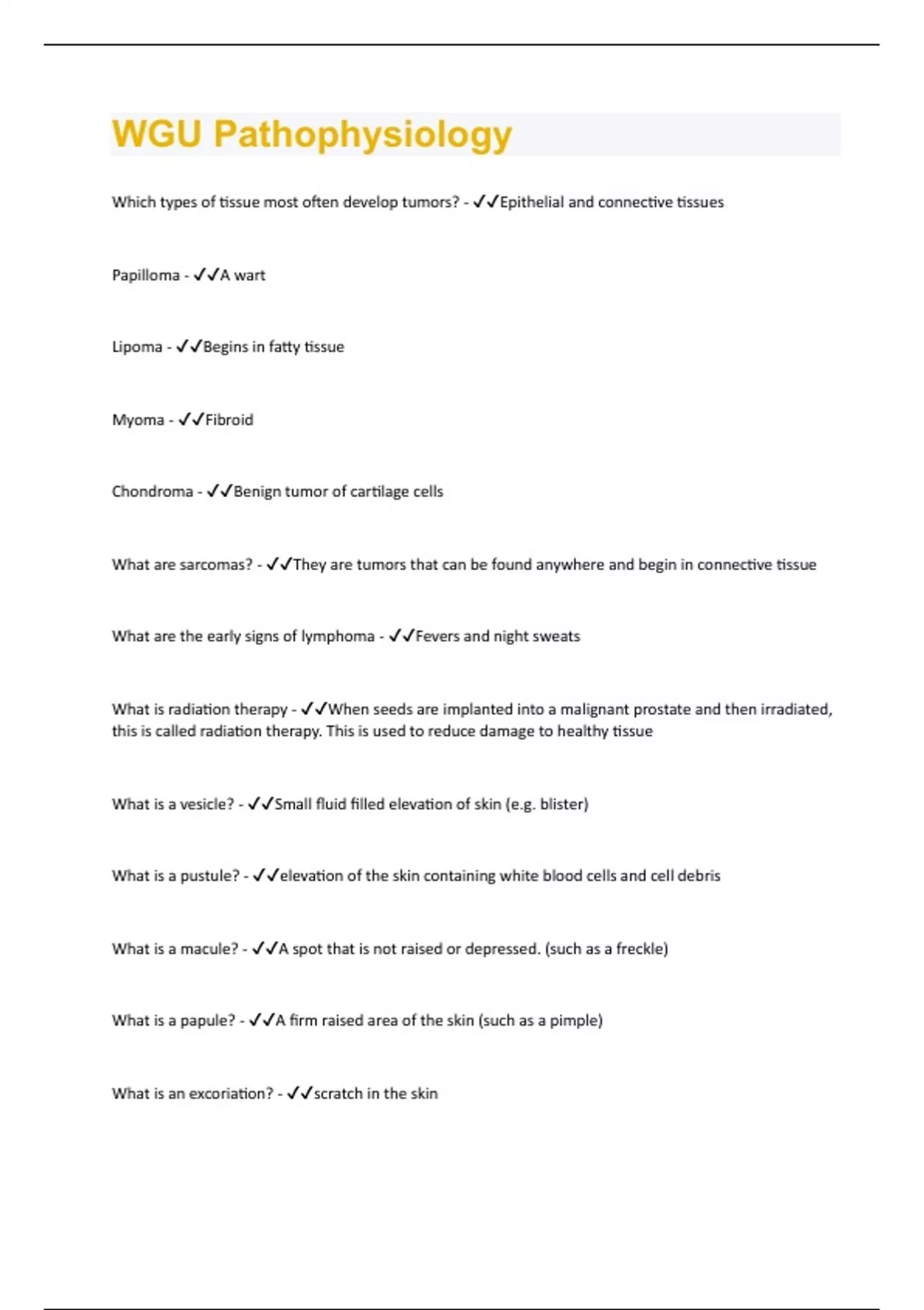 Which types of tissue most often develop tumors? - Epithelial and connective tissues Papilloma - A wart Lipoma - Begins in fatty tissue Myoma - Fibroid Chondroma - Benign tumor of cartilage cells What are sarcomas? - They are tumors that can be found anywhere and begin in connective tissue What are the early signs of lymphoma - Fevers and night sweats What is radiation therapy - When seeds are implanted into a malignant prostate and then irradiated, this is called radiation therapy. This is used to reduce damage to healthy tissue What is a vesicle? - Small fluid filled elevation of skin (e.g. blister) What is a pustule? - elevation of the skin containing white blood cells and cell debris What is a macule? - A spot that is not raised or depressed. (such as a freckle) What is a papule? - A firm raised area of the skin (such as a pimple) What is an excoriation? - scratch in the skinLaceration - Rough jagged wound