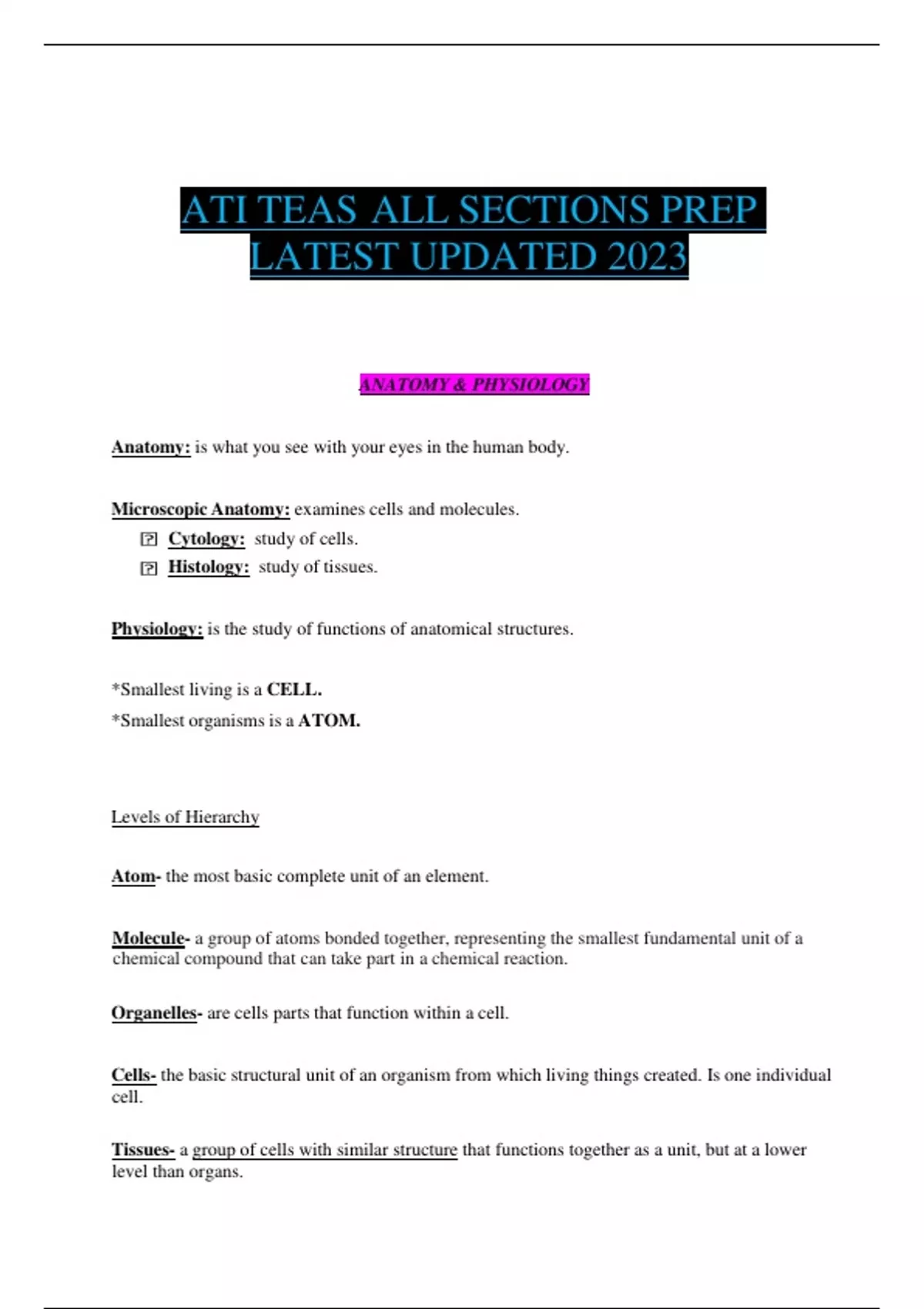 ATI TEAS ALL SECTIONS PREP LATEST UPDATED 2023 ANATOMY & PHYSIOLOGY Anatomy: is what you see with your eyes in the human body. Microscopic Anatomy: examines cells and molecules.  Cytology: study of cells.  Histology: study of tissues. Physiology: is the study of functions of anatomical structures. *Smallest living is a CELL. *Smallest organisms is a ATOM. Levels of Hierarchy Atom- the most basic complete unit of an element. Molecule- a group of atoms bonded together, representing the smallest fundamental unit of a chemical compound that can take part in a chemical reaction. Organelles- are cells parts that function within a cell. Cells- the basic structural unit of an organism from which living things created. Is one individual cell. Tissues- a group of cells with similar structure that functions together as a unit, but at a lower level than organs. Organ- a self contained part of an organism that performs specific functions. Is formed by two or more similar tissues. Organ System- functional groups of organs that work together within the body: circulatory, integumentary, skeletal, reproductive, digestive, urinary, respiratory, endocrine, lymphatic, muscular and nervous.  Humans have 11 Organ Systems. Cells Structure • Nucleus - holds the cells DNA in form of chromatin • Ribosomes- small structures that build proteins “amino acids”. • Golgi Apparatus- modifies and packages proteins secreted from cell. • Vacuoles - storage, digestion and waste removal. • Cytoskeletal- series of rod shaped proteins that provide shape/support cell. • Microtubules - part of the cytoskeletal. • Cytosol - liquid material in cell. • Cell membrane - separate internal and external cellular environment allows material to enter and exit cell. • Endoplasmic Reticulum- smooth or rough transport system of the cell. • Mitochondria- generates ATP powerhouse of the cell. ATP production is called cellular respiration Animal Cells Centrosome- pairs of centrioles involved in mitosis. Centriole- cylinders involved in cellular division. Lysosomes- the purpose of the lysosome is to digest things. They might be used to digest food or break down the cell when it dies. Cilia- cause cell to move. Flagella- whip tail to move cell.