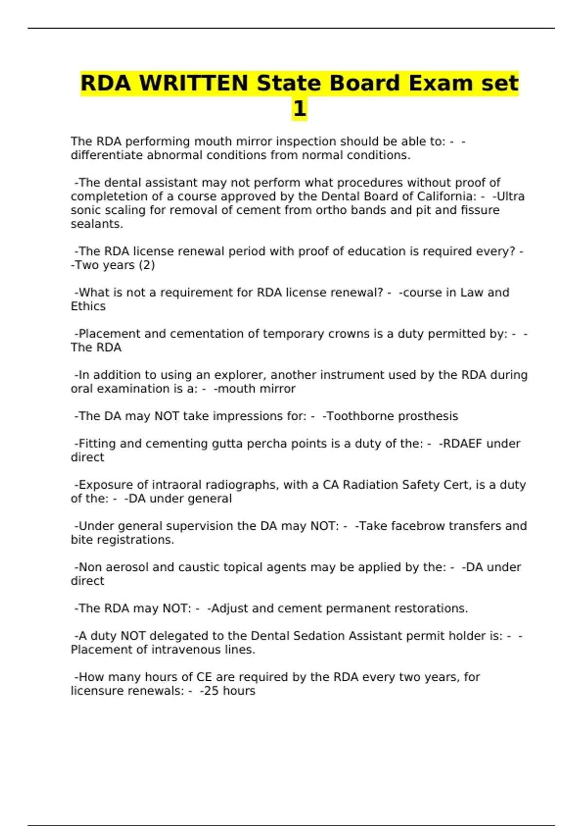 RDA WRITTEN State Board Exam set 1