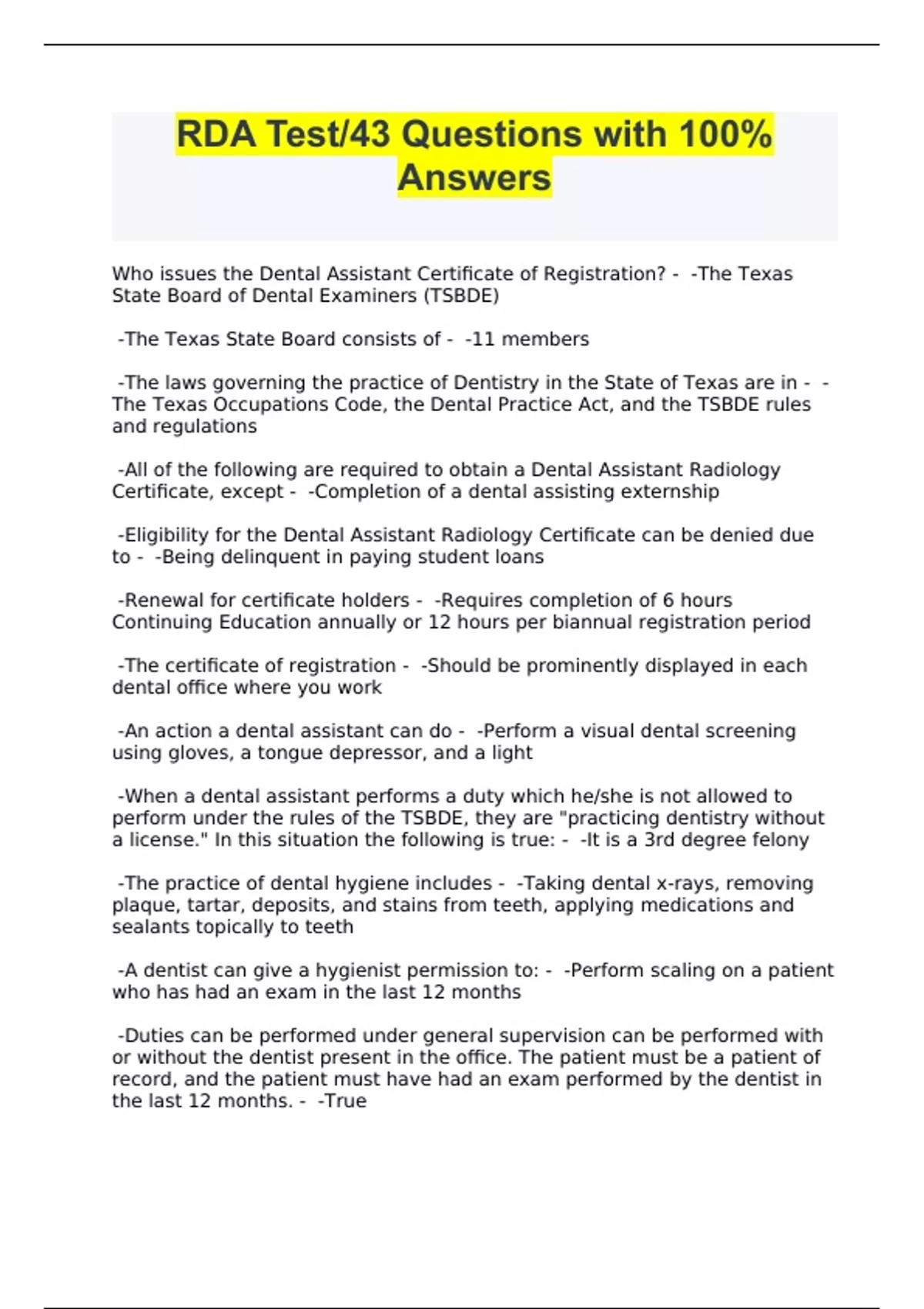 RDA Test/43 Questions with 100% Answers