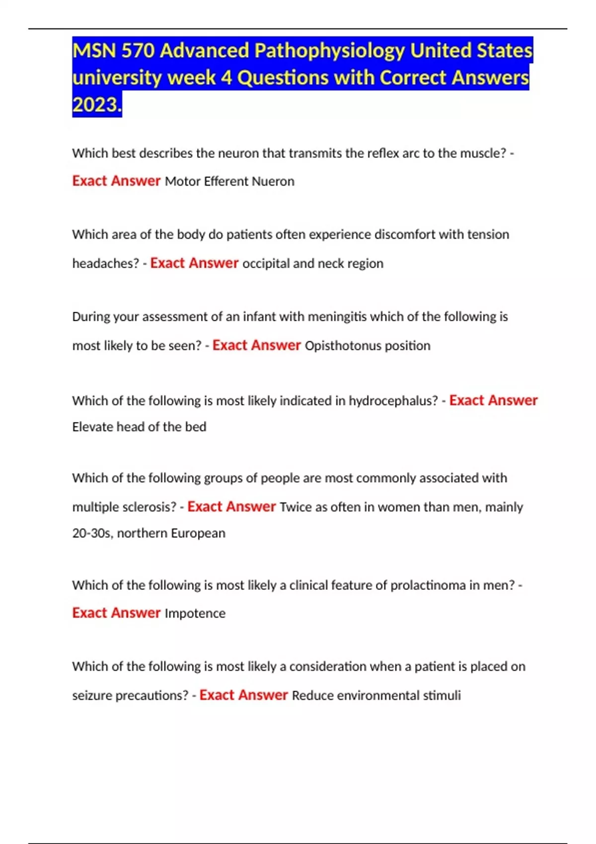 MSN 570 Advanced Pathophysiology United States university week 4 Questions with Correct Answers 2023.