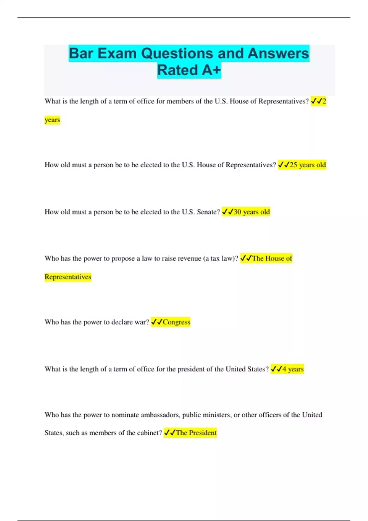 Bar Exam Questions and Answers Rated A+ What is the length of a term of office for members of the U.S. House of Representatives? 2 years How old must a person be to be elected to the U.S. House of Representatives? 25 years old How old must a person be to be elected to the U.S. Senate? 30 years old Who has the power to propose a law to raise revenue (a tax law)? The House of Representatives Who has the power to declare war? Congress What is the length of a term of office for the president of the United States? 4 years Who has the power to nominate ambassadors, public ministers, or other officers of the United States, such as members of the cabinet? The President Who is the Commander in Chief of the United States military? The President What is the citizenship requirement to run for president? Must be a natural born citizen For how long can a Supreme Court justice serve? For life as long as "good behavior" What are the two main sets of federal courts that have been authorized by Congress? The supreme and inferior courts Which court hears cases dealing with ambassadors? Federal courts Does a state or a federal court try cases dealing with disputes between states? Federal Court What can Congress do if the president vetoes a bill? override it with a 2/3 vote of both houses Who must approve any treaties that are made with foreign countries? the Senate Who must approve the president's appointments for ambassadors, Supreme Court justices, and other U.S. officials? the Senate Which branch has the power to decide whether law are constitutional? Judicial branch Who has the power to propose constitutional amendments? 2/3 of Congress or 2/3 of state legislatures Who approves amendments to the Constitution? 3/4 of state legislatures or 3/4 special state conventions Which amendment abolished slavery? 13th Which amendment gives 18 year olds the right to vote? 26th What is "the supreme law of the land"? U.S. Constitution Who has the power to regulate interstate commerce? Congress Who has the power to print and coin money? Congress What does the full faith and credit clause do? forces states to recognize the laws of other states