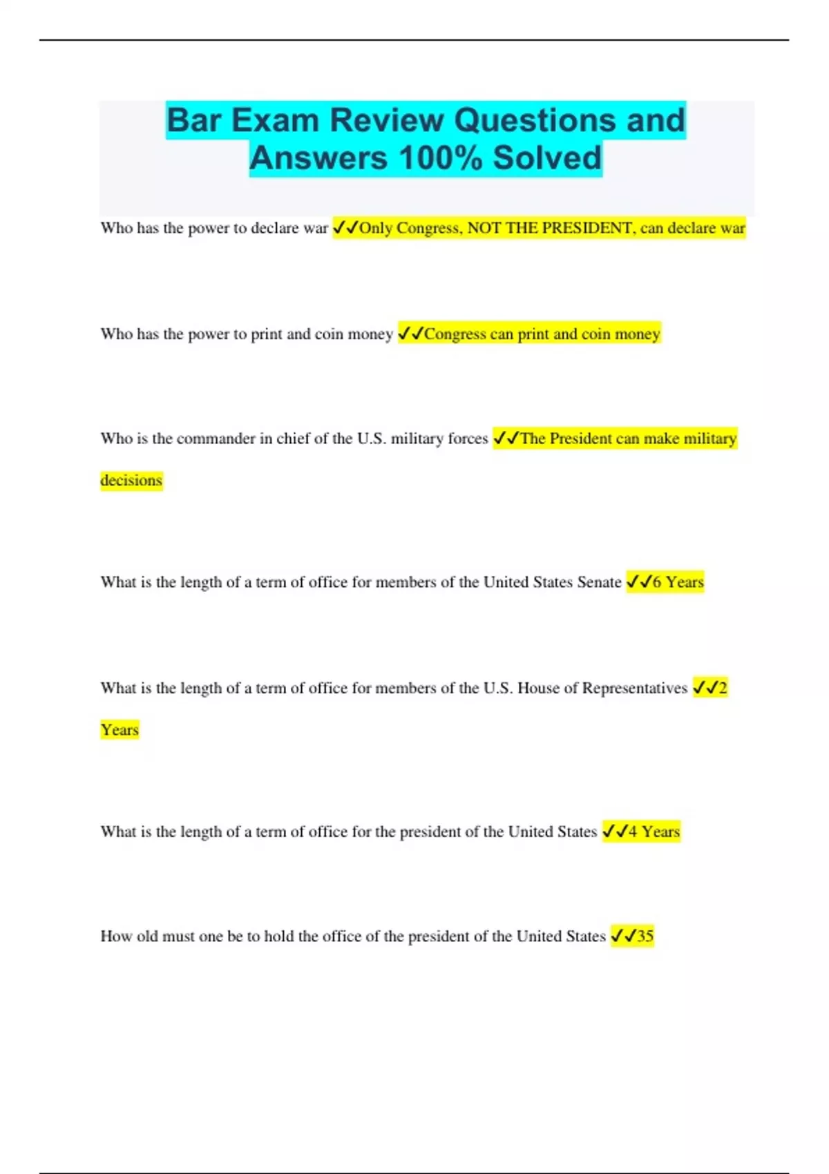 Bar Exam Review Questions and Answers 100% Solved Who has the power to declare war Only Congress, NOT THE PRESIDENT, can declare war Who has the power to print and coin money Congress can print and coin money Who is the commander in chief of the U.S. military forces The President can make military decisions What is the length of a term of office for members of the United States Senate 6 Years What is the length of a term of office for members of the U.S. House of Representatives 2 Years What is the length of a term of office for the president of the United States 4 Years How old must one be to hold the office of the president of the United States 35 How many members of the Supreme Court are there 9 What is the length of the term of office for justices of the U.S. Supreme Court Life Who has the power to settle disputes between different states Judicial Branch Who has the power to propose a law to raise revenue (a tax law) House of Representatives Who must approve judges, cabinet members, and ambassadors that the president appoints to government positions Senate Who has the power to veto laws The President has the power to reject proposed laws (bills). How many amendments have been made to the Constitution 27 How many members of Congress are there 535 What is the supreme law of the land Constitution Who has the power to nominate ambassadors, public ministers, or other of the United States, such as members of the Cabinet The President can make nominations How old must a person be to elected to the U.S. House of Representatives 25 What fraction of states must approve an amendment to the Constitution 3/4 How many branches does the American government have 3 Branches The House of Representatives and the Senate together are referred to as _____________________. House of Representatives + Senate = Congress