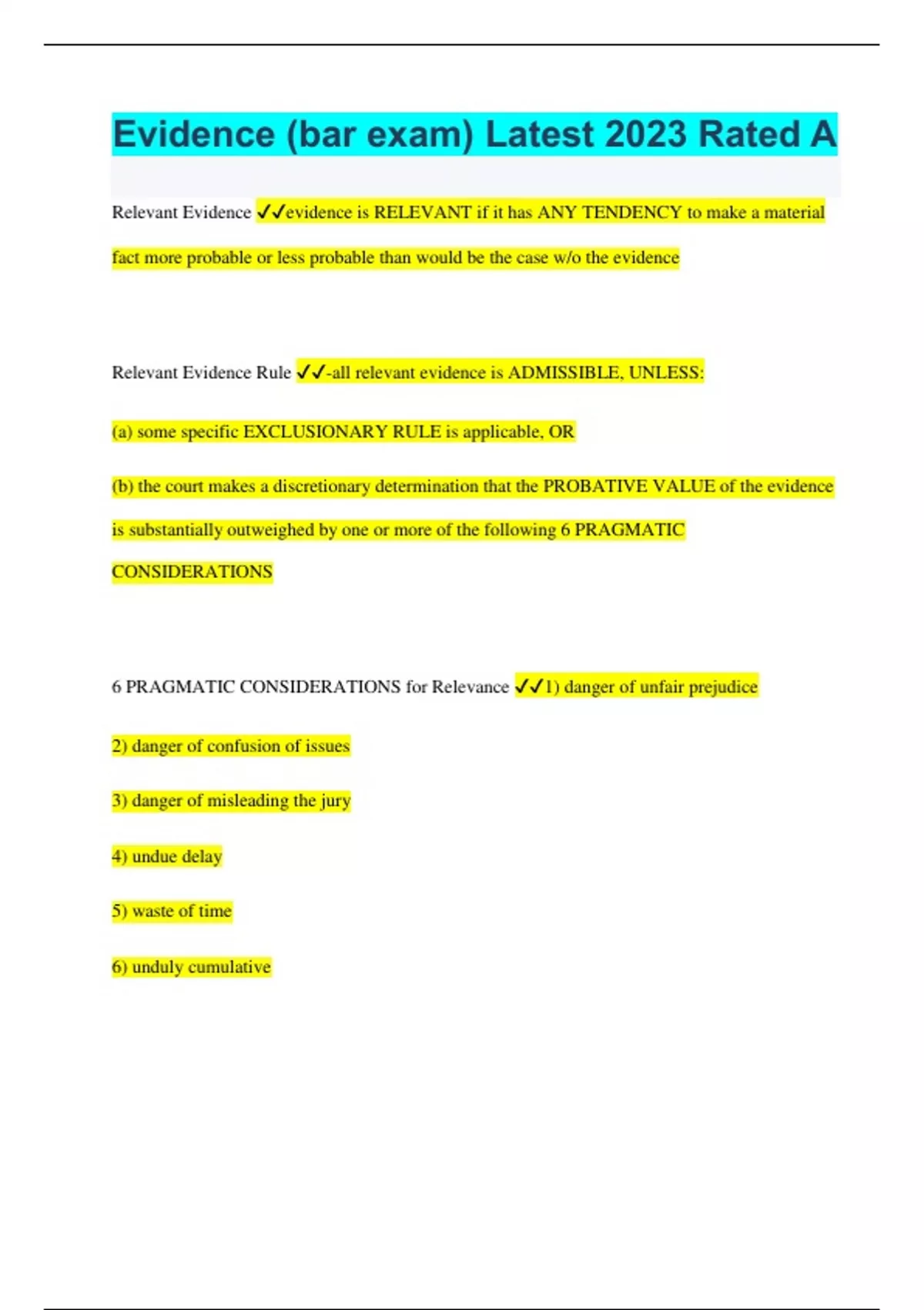 Evidence (bar exam) Latest 2023 Rated A Relevant Evidence evidence is RELEVANT if it has ANY TENDENCY to make a material fact more probable or less probable than would be the case w/o the evidence Relevant Evidence Rule -all relevant evidence is ADMISSIBLE, UNLESS: (a) some specific EXCLUSIONARY RULE is applicable, OR (b) the court makes a discretionary determination that the PROBATIVE VALUE of the evidence is substantially outweighed by one or more of the following 6 PRAGMATIC CONSIDERATIONS 6 PRAGMATIC CONSIDERATIONS for Relevance 1) danger of unfair prejudice 2) danger of confusion of issues 3) danger of misleading the jury 4) undue delay 5) waste of time 6) unduly cumulative Similar Occurrences - General Rule -if evidence concerns SOME TIME, EVENT, OR PERSON OTHER THAN THAT INVOLVED IN THE CASE AT HAND, the evidence is ADMISSIBLE. -probative value is usually outweighed by pragmatic considerations 6 recurring situations that have produced concrete rules that may permit admissibility 1) Plaintiff's Accident History 2) Similar Accidents Caused by Same Event or Condition 3) Intent in Issue 4) Comparable Sales on Issue of Value 5) Habit 6) Industrial Custom as Standard of Care Plaintiff's Accident History -RULE: plaintiff's accident history is INADMISSIBLE b/c it shows nothing more than the fact that the plaintiff is accident-prone → this is just general character evidence -EXCEPTION → plaintiff's prior accidents are admissible IF: the cause of the plaintiff's injuries is an issue -EXAM TIP: always ask yourself - For what purpose is the evidence being offered? Similar Accidents Caused by Same Event or Condition -RULE: other accidents involving defendant are inadmissible b/c they suggest nothing more than general character for carelessness -EXCEPTION → other accidents involving the same instrumentality or condition may be admitted for three potential purposes IF the other accident occurred under substantially similar circumstances: 1) to show the existence of a dangerous condition;