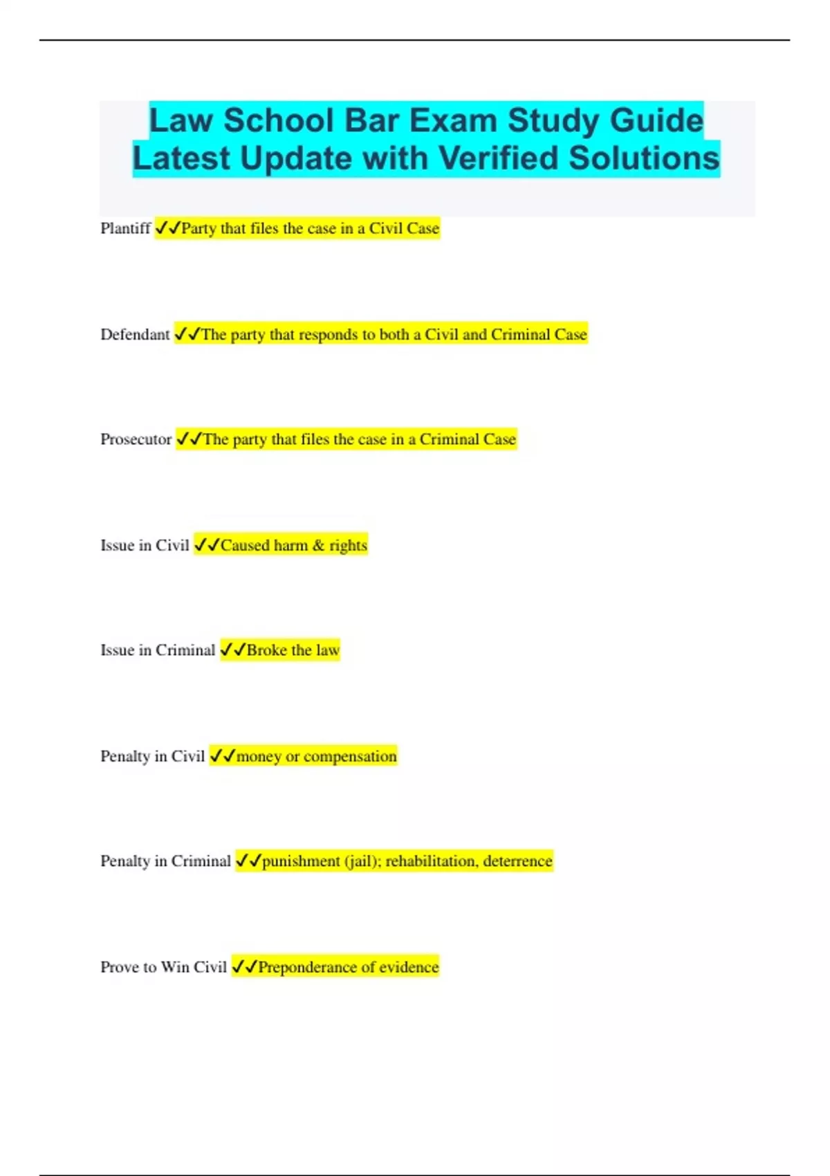 Law School Bar Exam Study Guide Latest Update with Verified Solutions Plantiff Party that files the case in a Civil Case Defendant The party that responds to both a Civil and Criminal Case Prosecutor The party that files the case in a Criminal Case Issue in Civil Caused harm & rights Issue in Criminal Broke the law Penalty in Civil money or compensation Penalty in Criminal punishment (jail); rehabilitation, deterrence Prove to Win Civil Preponderance of evidence Prove to Win Criminal Person is guilty beyond reasonable doubt Jury Age At least 18 Jury Citizenship US Citizenship Judicial District live at least 1 year Jury Felonies cannot have been convicted of a felony Jury Language Proficient in English Jury Physical & Mental State You can not have a disqualifying mental or physical conditions that alters your objectivity Lawyer knowledge You can know the lawyer, parties on the case, but they will meet to decide if you will be on the case