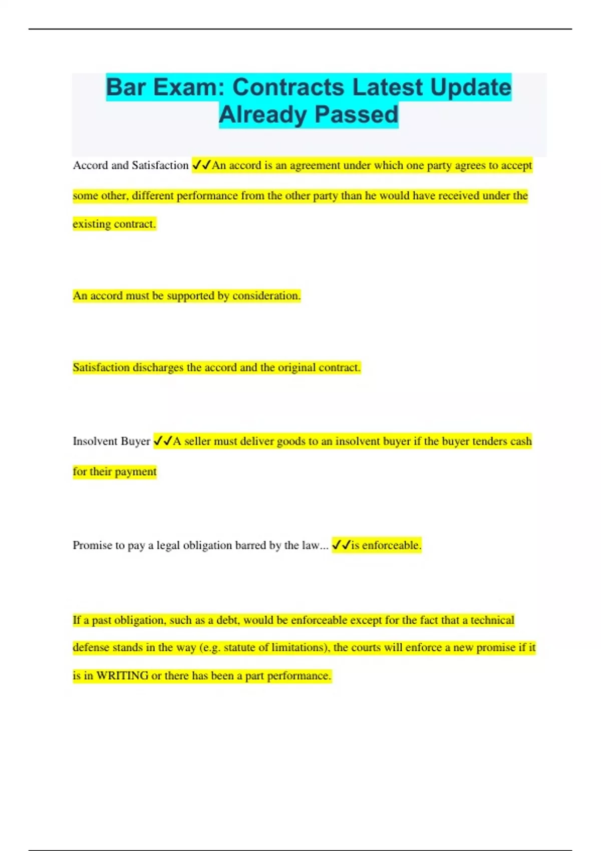 Bar Exam: Contracts Latest Update Already Passed Accord and Satisfaction An accord is an agreement under which one party agrees to accept some other, different performance from the other party than he would have received under the existing contract. An accord must be supported by consideration. Satisfaction discharges the accord and the original contract. Insolvent Buyer A seller must deliver goods to an insolvent buyer if the buyer tenders cash for their payment Promise to pay a legal obligation barred by the law... is enforceable. If a past obligation, such as a debt, would be enforceable except for the fact that a technical defense stands in the way (e.g. statute of limitations), the courts will enforce a new promise if it is in WRITING or there has been a part performance. No additional consideration is needed in order for the contract to be enforceable. Unilateral Contract one in which the offer requests performance rather than a promise to perform, and under the First and Second Restatements, as well as the UCC, once performance has begun the offer CANNOT be REVOKED as to that performer. The offer can be revoked as to others who have not yet begun to perform. Ambiguity When there is ambiguous contract language...where one party is aware of the ambiguity and the other party is not at the time of contracting, a contract will be enforced according to the intent of the part who was unaware of the ambiguity. If neither party, or both parties, are aware of the ambiguity, no contract would be formed unless both parties intended the same meaning. Option Contract A distinct contract in which an offeree gives consideration for a promise by the offeror not to revoke an outstanding offer. Unequivocal words of rejection by the offer will not extinguish an option, absent detrimental reliance on the part of the offeror. Accommodation When a seller ships both conforming and nonconforming goods along with a note explaining that the nonconforming goods are offered as an accommodation to the buyer, this constitutes a COUNTEROFFER. The buyer is free to accept or reject. A shipment of nonconforming goods without the note would be an acceptance and a breach of contract. Merchant's Firm Offer Applies only when the merchant signs a written offer giving assurances that he will hold the offer open for a stated time period; in such cases, the offer is irrevocable for the stated period or for a reasonable time period if no period is stated (not to exceed 3 months). The intent to create an option contract must be expressly stated in writing, which did not happen here. Specific Performance-Nonbreaching Party's Rights A non breaching party may seek specific performance if the legal remedy (i.e. damages) is inadequate. Damages are generally inadequate when the subject matter of the contract tis rare or unique. However, if the ubsnect matter has already been sole to another, who purchased for value and in good faith (a BFP), the right to specific performance is cut off. F.O.B. (Free on Board) Under an F.O.B. delivery term, the seller is obligated to get the goods to the destination indicated and make a reasonable contract for freight if the destination indicated is not the buyer's place of business. The seller has the risk of loss until the goods make it to the destination, and thereafter the buyer has the risk. Rights of a Donee Beneficiary Rights vest when the beneficiary materially changes position in justifiable reliance on the promise. The promisor may raise any defense against the third party beneficiary that it would have against the promisee, including illegality. when a promisee tells the donee beneficiary of the contract and should foresee reliance by the beneficiary, and the beneficiary reasonably relies to her detriment, the beneficiary can sue the promisee directly under a promissory estoppel/detrimental reliance theory. Additional Terms in Contracts Between Merchants Will be included unless: 1) they materially alter the original terms of the offer; 2) the offer expressly limits acceptance to the terms of the offer; OR 3) the offeror has already objected to the particular items, or objects within a reasonable time after notice of them is received Conditional Acceptance When an acceptance is made expressly conditional on the acceptance of new terms, it is a rejection of the offer. It can be considered a counteroffer only to the extent that the original offeror may expressly assent to the new terms and thus form a contract. It is NOT considered a counteroffer that can be accepted by performance. Perfect Tender Rule Allows rejection for any defect, and does not require material breach. However, rules permit the seller to cure the defect by giving reasonable notice of an intention to cure and making a new tender of conforming goods within the time originally provided for performance. Where the buyer rejects a tender that the seller reasonably believed would be acceptable, the seller, upon reasonable notification of the buyer, has a further reasonable time beyond the original contract time within which to make a conforming tender. Parol Evidence Rule When the parties to a contact express their agreement in a writing with the intent that it embody the final expression of their bargain (the writing is an integration) any other other expressions --written or oral--made PRIOR to or CONTEMPORANEOUS WITH the writing, are inadmissible to vary the terms of the writing. Evidence of custom in the trade can be offered regardless of the completeness of the written agreement. Merger Clause Recites the agreement is the complete agreement between the parties. Usually determinative in large commerce contracts. Gap Fillers In a contract for the sale of goods, the key to forming a contract is the quantity term .If other terms are missing from the agreement, aRticle 2 has gap filler provisions to fill in the missing terms. Place of delivery: if not specific then usually it's the seller's place of business, if he has one; oth