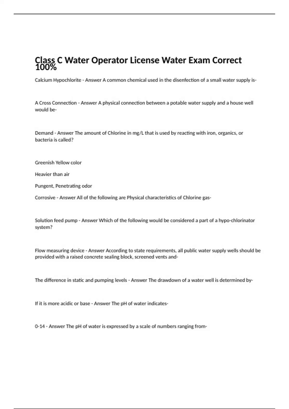 Calcium Hypochlorite - Answer A common chemical used in the disenfection of a small water supply is- A Cross Connection - Answer A physical connection between a potable water supply and a house well would be- Demand - Answer The amount of Chlorine in mg/L that is used by reacting with iron, organics, or bacteria is called? Greenish Yellow color Heavier than air Pungent, Penetrating odor Corrosive - Answer All of the following are Physical characteristics of Chlorine gas- Solution feed pump - Answer Which of the following would be considered a part of a hypo-chlorinator system? Flow measuring device - Answer According to state requirements, all public water supply wells should be provided with a raised concrete sealing block, screened vents and- The difference in static and pumping levels - Answer The drawdown of a water well is determined by- If it is more acidic or base - Answer The pH of water indicates- 0-14 - Answer The pH of water is expressed by a scale of numbers ranging from- 7.0 - Answer Water that is considered neutral is expressed on the pH scale at- Use of an approved, sterile container - Answer Which of the following is a required step in collecting a routine distribution sample for bacteriological testing? Turbidity - Answer Sand filtration will remove which of the following from surface water? Taste and Odor control - Answer Activated Carbon is used in a Surface Water Plant primarily for? Alum and Ferric Chloride - Answer Which of the following chemical(s) are commonly used as coagulants in surface water treatment? Screened Vents An approved locking roof hatch An overflow pipe with hinged flap device Annual inspection and maintenance as needed - Answer Ground storage tanks are required to be provided with which of the following? Painting Cathodic protection Water stabilization - Answer An elevated storage tank should be protected against corrosion by- 35 psi - Answer A public water supply system should maintain residual pressure of 20 psi and a minimum normal operating pressure of- 50 mg/L - Answer Before a new or repaired water line is placed into service, it must be properly disinfected by providing a chlorine dosage of _____ and proper detention time. Aquifers - Answer Water bearing formations beneath the earth's surface that are used as a source of water for public water supplies are- Determine water levels in the well - Answer The purpose of an air line on a well is- Reduce the amount of sand pumped - Answer The mesh size is an important feature of a well screen because property sized openings should- pH, alkalinity, temperature, and chemical dosage - Answer When treating surface water, the process of coagulation will be most affected by the- When the loss of head gauge indicated between 6 and 10 ft. - Answer A rapid sand filter should be backwashed when- 0.2 mg/L free chlorine residual 0.5 mg/L chloramine residual for a surface water supply 0.8 mg/L chloramine residual when using chloramine treatment 0.5 mg/L free chlorine residual for a groundwater supply - Answer Which of the following is an acceptable disinfection residual at the far reaches of the distribution system- 8.34 lbs - Answer One gallon of water weighs- .433 lbs - Answer One foot of water inside a storage vessel will raise a pressure gauge at the bottom of the vessel by- 1000 ft - Answer A raw water intake structure may not be constructed within _____ feet of a boat ramp, dock, or marina Vertical Turbine Submersible - Answer Common Type(s) of pump(s) for use in water wells are- Hydrological Cycle - Answer _____ is the natural exchange of water between the earth and air. 24 hours - Answer If and when a health hazard contamination event occurs in a public water system, the operator must contact the state regulatory authority within ___ hours by telephone. Maintained at adequate pressure Pathogen free Contains a chlorine residual - Answer Potable water is that of- Blue babies - Answer Excessive nitrates in drinking water can cause a condition that affects infants under the age of 6 months. This condition is known as- Coagulation - Answer In surface water treatment the process of causing the fine particles in the water to join together to form larger heavier particles that settle in a clarifier is called- Jar test - Answer The test commonly used to determine the chemical dosage for the surface water plant is the ___ test. Can be filtered with additional treatment Cause mud balls and filter plugging - Answer Suspended solids are the solids portion that- Coliform - Answer A public water system is required to take samples of water for bacteriological analysis. The organism that is used as an indicator is called- Residual - Answer Chlorine dosage is demand plus desired ___ Stand pipe - Answer A storage vessel that is the same diameter from the ground to the top and is more than 20 feet but less than 85 feet is called a- 35 psi - Answer Potable water must be stored at an elevation at least 80.85 feet above the highest known connection to provide the minimum operating pressure of- Hydro pneumatic tank - Answer A water tank that uses compressed air over water to provide pressure is called a- 8.0% - Answer According to the lead and copper rule, pipe and fittings may not contain more than ___ lead or solder and flux may not contain more than 0.2% lead. Red - Answer When testing for chlorine residual DPD is used as an indicator, when DPD is added to water containing chlorine what color does the sample turn? Gate valve - Answer The most common valve(s) used for isolating a water leak is the ___ valve. Water hammer - Answer In the distribution system when a valve or hydrant is opened or closed too fast it could result in a- Centrifugal - Answer The most commonly used pump in the distribution system is- 250 - Answer A Texas Class D Certified Operator can operate a public water system up to ___ connections. 3 years - Answer All state of Texas Operator License's after issue are good for ___ years. Collect another sample a