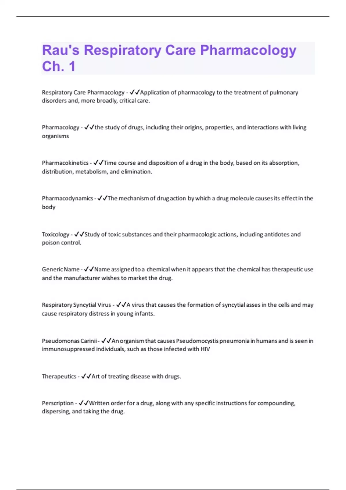 Respiratory Care Pharmacology - Application of pharmacology to the treatment of pulmonary disorders and, more broadly, critical care. Pharmacology - the study of drugs, including their origins, properties, and interactions with living organisms Pharmacokinetics - Time course and disposition of a drug in the body, based on its absorption, distribution, metabolism, and elimination. Pharmacodynamics - The mechanism of drug action by which a drug molecule causes its effect in the body Toxicology - Study of toxic substances and their pharmacologic actions, including antidotes and poison control. Generic Name - Name assigned to a chemical when it appears that the chemical has therapeutic use and the manufacturer wishes to market the drug. Respiratory Syncytial Virus - A virus that causes the formation of syncytial asses in the cells and may cause respiratory distress in young infants. Pseudomonas Carinii - An organism that causes Pseudomocystis pneumonia in humans and is seen in immunosuppressed individuals, such as those infected with HIV Therapeutics - Art of treating disease with drugs. Perscription - Written order for a drug, along with any specific instructions for compounding, dispersing, and taking the drug.Code Name - Name given to an experimental chemical that shows potential as a drug.