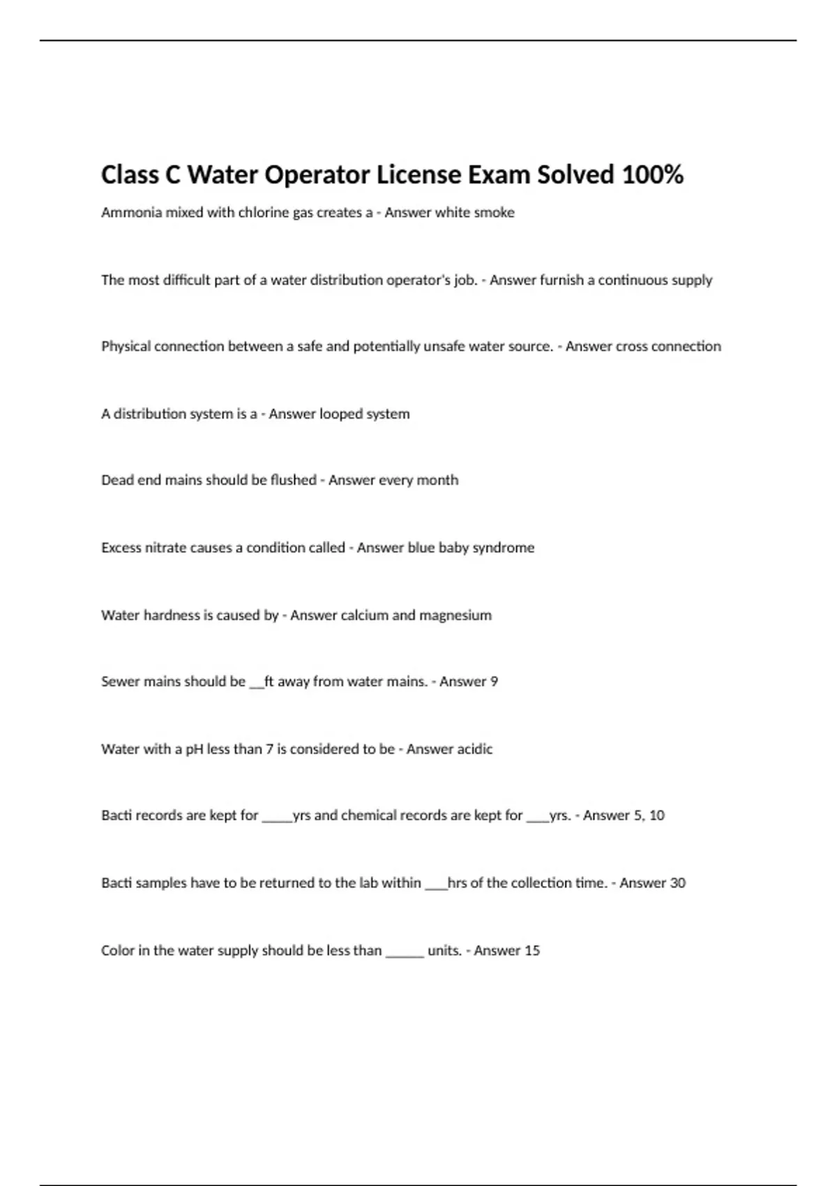 Ammonia mixed with chlorine gas creates a - Answer white smoke The most difficult part of a water distribution operator's job. - Answer furnish a continuous supply Physical connection between a safe and potentially unsafe water source. - Answer cross connection A distribution system is a - Answer looped system Dead end mains should be flushed - Answer every month Excess nitrate causes a condition called - Answer blue baby syndrome Water hardness is caused by - Answer calcium and magnesium Sewer mains should be __ft away from water mains. - Answer 9 Water with a pH less than 7 is considered to be - Answer acidic Bacti records are kept for ____yrs and chemical records are kept for ___yrs. - Answer 5, 10 Bacti samples have to be returned to the lab within ___hrs of the collection time. - Answer 30 Color in the water supply should be less than _____ units. - Answer 15 Chlorine is ______ times heavier than air. - Answer 2.5 90% of underground pipe failures are related to improper - Answer backfill and bedding The spoil bank should be located at least ___ft away from the ditch. - Answer 2 The following minimum residuals is ______mg/L for free chlorine and ____mg/L for total chlorine. - Answer .2, .5 Public opinion of the water utility is _______ at a standstill. - Answer never A bacti sample should be taken every ____ft of pipe. - Answer 1000 The most common collection point for a bacti sample is the water tap _______. - Answer outside the house A standpipe is considered ground storage unless it exceeds _____ft above the highest ________. - Answer 80, service connection ________ protection is the electrochemical method for preventing ________ of metal tanks. - Answer cathodic, corrosion The _____ is the only cross connection control method approved by _______. - Answer air gap, tceq _______ on a pipeline depend on the _____ or coefficient of pipe roughness. - Answer friction loss, c factor __________ occurs whenever there is a ______ in the velocity or direction of water flow. - Answer water hammer, sudden change The ______ water pressure required by the rules and regulations is ____psi under any and all conditions. - Answer minimum, 20 100, 150, 200 and 250 are approved classes of _____ _____. - Answer working pressure ______ is used to anchor pipe bends. - Answer concrete A general deposit of mineral particles evenly along the inside of the pipe is ________. - Answer tuberculation Shoring should be used if a ditch is ___ft or deeper. - Answer 5 A written sample writing plan is required for _______ monitoring. - Answer coliform Ladders should be placed every ___ft in a ditch. - Answer 25 An oxygen deficient atmosphere is defined as one which contains _____ than ______ % oxygen. - Answer less, 19.5 Characteristics of a Centrifugal Pump: as the head _____ the discharge ________. - Answer increases, decreases The operator should leave a ________ of slack in flexible tubing. - Answer gooseneck The most common type of water meter is the ____ ____ meter. - Answer positive displacement Safe withdrawal weight from a 150lb cylinder is ___lbs and 400lbs from a ____ton cylinder. - Answer 40, 1 The most common valve is the _______. - Answer gate valve The most commonly used fire hydrants used in distribution systems are the _________. - Answer dry barrel