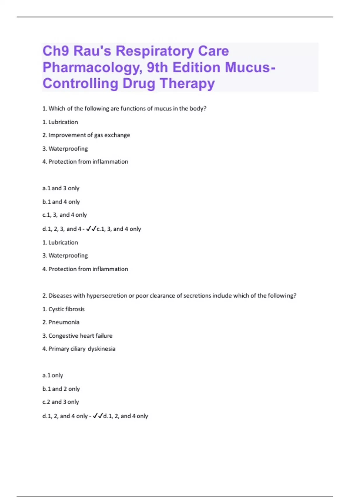 . Which of the following are functions of mucus in the body? 1. Lubrication 2. Improvement of gas exchange 3. Waterproofing 4. Protection from inflammation a.1 and 3 only b.1 and 4 only c.1, 3, and 4 only d.1, 2, 3, and 4 - c.1, 3, and 4 only 1. Lubrication 3. Waterproofing 4. Protection from inflammation 2. Diseases with hypersecretion or poor clearance of secretions include which of the following? 1. Cystic fibrosis 2. Pneumonia 3. Congestive heart failure 4. Primary ciliary dyskinesia a.1 only b.1 and 2 only c.2 and 3 only d.1, 2, and 4 only - d.1, 2, and 4 only1. Cystic fibrosis 2. Pneumonia 4. Primary ciliary dyskinesia 3. Medications that increase mucociliary or cough efficiency are inetics. ytics. egulatory agents. torants. - inetics.