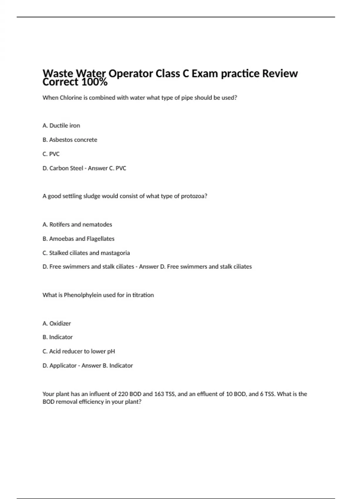 When Chlorine is combined with water what type of pipe should be used? A. Ductile iron B. Asbestos concrete C. PVC D. Carbon Steel - Answer C. PVC A good settling sludge would consist of what type of protozoa? A. Rotifers and nematodes B. Amoebas and Flagellates C. Stalked ciliates and mastagoria D. Free swimmers and stalk ciliates - Answer D. Free swimmers and stalk ciliates What is Phenolphylein used for in titration A. Oxidizer B. Indicator C. Acid reducer to lower pH D. Applicator - Answer B. Indicator Your plant has an influent of 220 BOD and 163 TSS, and an effluent of 10 BOD, and 6 TSS. What is the BOD removal efficiency in your plant? A. 92% B. 94% C. 95% D. 96% - Answer C. 95% You suspect your anaerobic digester is going sour. What is the best way to verify its condition? A. pH B. Foam type C. VA/ALK ratio D. DO - Answer C. VA/ALK ratio Before operating any piece of equipment what should be done? A. Lock out Tag out (remember, safety first!) B. Read O & M manual C. Read manufacturers manual D. Notify supervisor - Answer C. Read manufacturers manual Detritus is noticed in your grit channel. What is the problem? A. Velocity too fast with short D/T B. Velocity too low with long D/T C. Short circuiting D. Density currents - Answer B. Velocity too low with long D/T What is considered normal operation of an aerobic digester? A. Fill react B. Skim off foam when needed C. Settle and Decant as needed D. Feed only during low flow or constant when the sun is out - Answer C. Settle and Decant as needed A plant with a flow of 1 MGD should be monitored A. Continuously B. Intermittently C. Daily D. Every four hours depending on surface load - Answer A. Continuously What do total solids consist of? A. Dissolved and settleable B. Floatable and settlable C. Suspended and dissolved D. Settlable and nonsettleable - Answer C. Suspended and dissolved What would cause excessive wear on bearing? A. Misalignment B. Reduced Oil due to low viscosity C. Blow seal D. Over tubercation - Answer A. Misalignment Amperometric titration is used to measure A. Dissolved solids B. Chlorine residual C. Colloids D. Emulsions - Answer B. Chlorine residual What growth phase is an aerobic digester operated in. A. Log B. Lag C. Endogenous respiration D. Declining phase - Answer C. Endogenous respiration If excessive pressure builds up in a chlorine tank due to excessive heat. What will prevent explosions? A. Valve seat adjustments B. Heat reducing valve C. Fusible plug D. Check valve - Answer C. Fusible plug You notice that your bearings are excessively hot on a pump, why? A. Ambient temperature too high B. Over lubrication C. Oil seal blown D. Discharge rate too low - Answer B. Over lubrication Where can you gain access for collection system maintenance? A. Lift station B. Force main C. Man hole D. Gravity main - Answer C. Man hole Low DO and nutrient deficiency will promote the growth of what? A. Rotifers B. Filamentous bacteria C. Spirillium D. Amoebas - Answer B. Filamentous bacteria When charging a lead-acid type battery for a composite sampler, what dangerous gas could be produced? A. Hydrogen B. Oxygen C. Hydrogen sulfide D. Cyanide - Answer A. Hydrogen What is the best method in dealing with a chemical spill? A. Contain and clean up B. Saw dust and kitty litter C. Foam congaing super trimethyl bromine D. Flood with water - Answer A. Contain and clean up There is septic wastewater entering your primary clarifier. What is the problem? A. Aerobic conditions in the collections system B. Lift station pumps operating on short cycles C. Anaerobic conditions in the collections systems D. High flows due to a low MCRT - Answer C. Anaerobic condition in the collections system Which of the following substances is highly viscous and very slippery? A. Calcium hypochlorite B. Calcium oxide C. Potassium permanganate D. Polymer - Answer D. Polymer If you pump green sludge to a drying bed what chemical should be applied? A. Polymer B. Lime C. Cl2 D. Alum - Answer B. Lime Chlorine leaks can be detected by? A. ISCBA B. Ammonia solution with Q-Tip C. Alcohol vapor D. Spray with mist of water - Answer B. Ammonia solution with Q-Tip What takes place in the stabilization tank in a contact stabilization plant? A. Adsorption B. Clarification C. BNR D. Absorption - Answer D. Absorption Why is an aerobic digester covered? A. Hold in gas B. Protect for contaminants C. Reduce radiation D. Protect from cold weather - Answer D. Protect from cold weather Which of the following would you not use a grab sample on? A. BOD B. DO C. pH D. Temp - Answer A. BOD Staffing is based on what? A. Budget B. Flow and type of treatment C. City Hall D. Chief operator - Answer B. Flow and type of treatment What condition does an operator have the least amount of control over? A. Flow B. Wasting Rate C. F/M ratio D. Temp - Answer D. Temp Why would you chlorinate the RAS line? A. Remove struvite B. Lower the pH of incoming C. Control Filamentous bacteria D. Meet chlorine demand - Answer C. Control Filamentous bacteria What is the most common type of pond? A. Anaerobic B. Aerobic C. Facultative D. Polishing - Answer C. Facultative The ash content in lab procedures is the same as? A. Organic solids B. Volatile solids C. Inorganic solids D. Total solids - Answer C. Inorganic solids Denitrification will cause what? A. Straggler floc B. Rising sludge C. Methane production D. Low MLSS - Answer B. Rising sludge