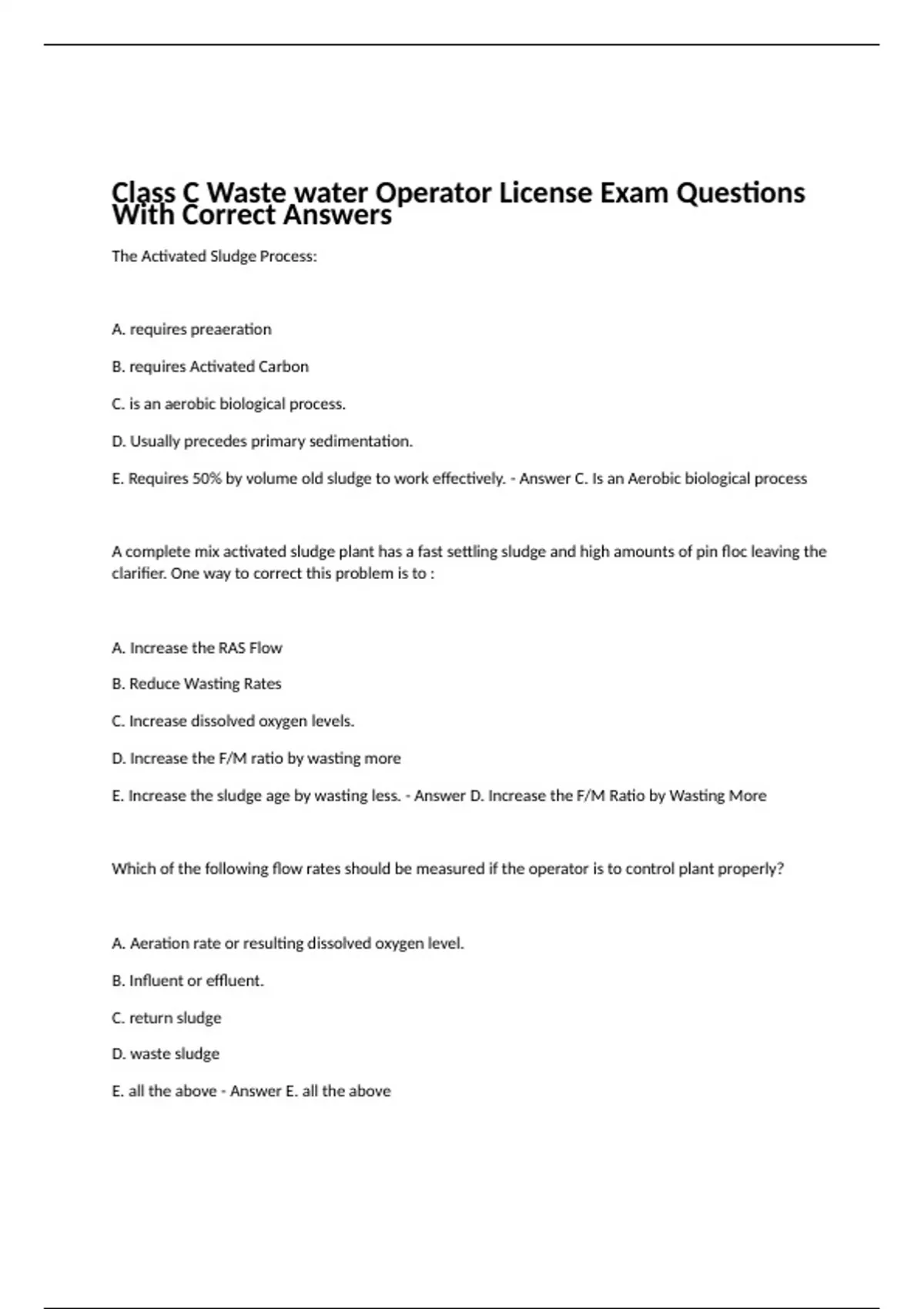 Class C Waste water Operator License Exam Questions With Correct Answers