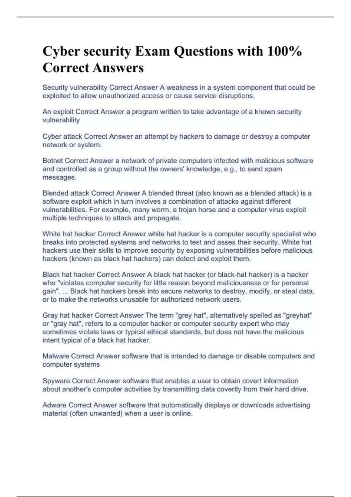 Cyber security Exam Questions with 100% Correct Answers